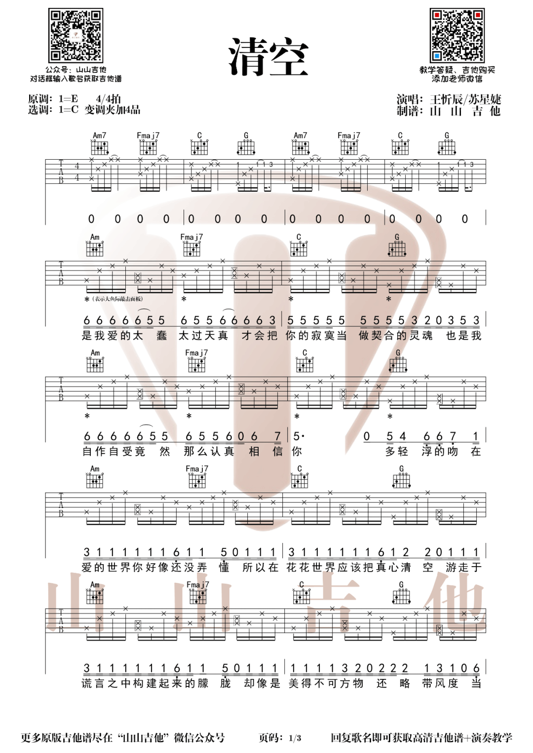 曲谱介绍: 王忻辰/苏星婕《清空》吉他弹唱谱,采用C调指法编配原版,共有3张高清图谱。