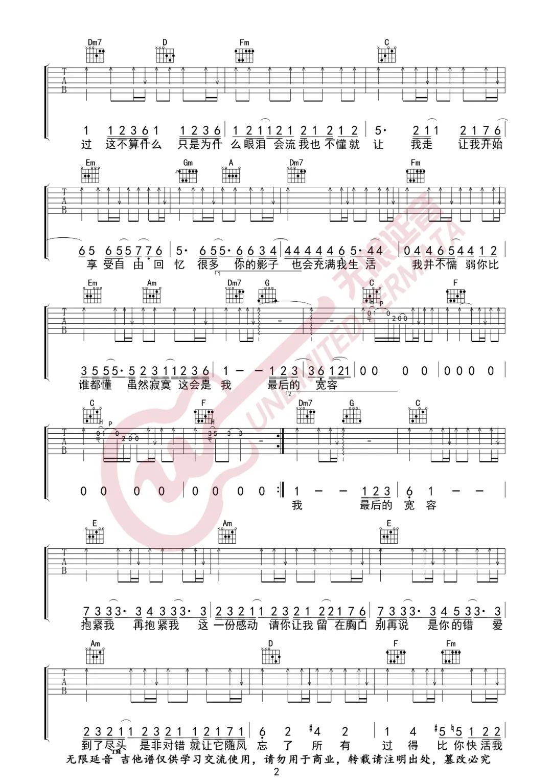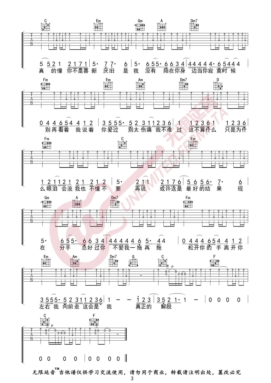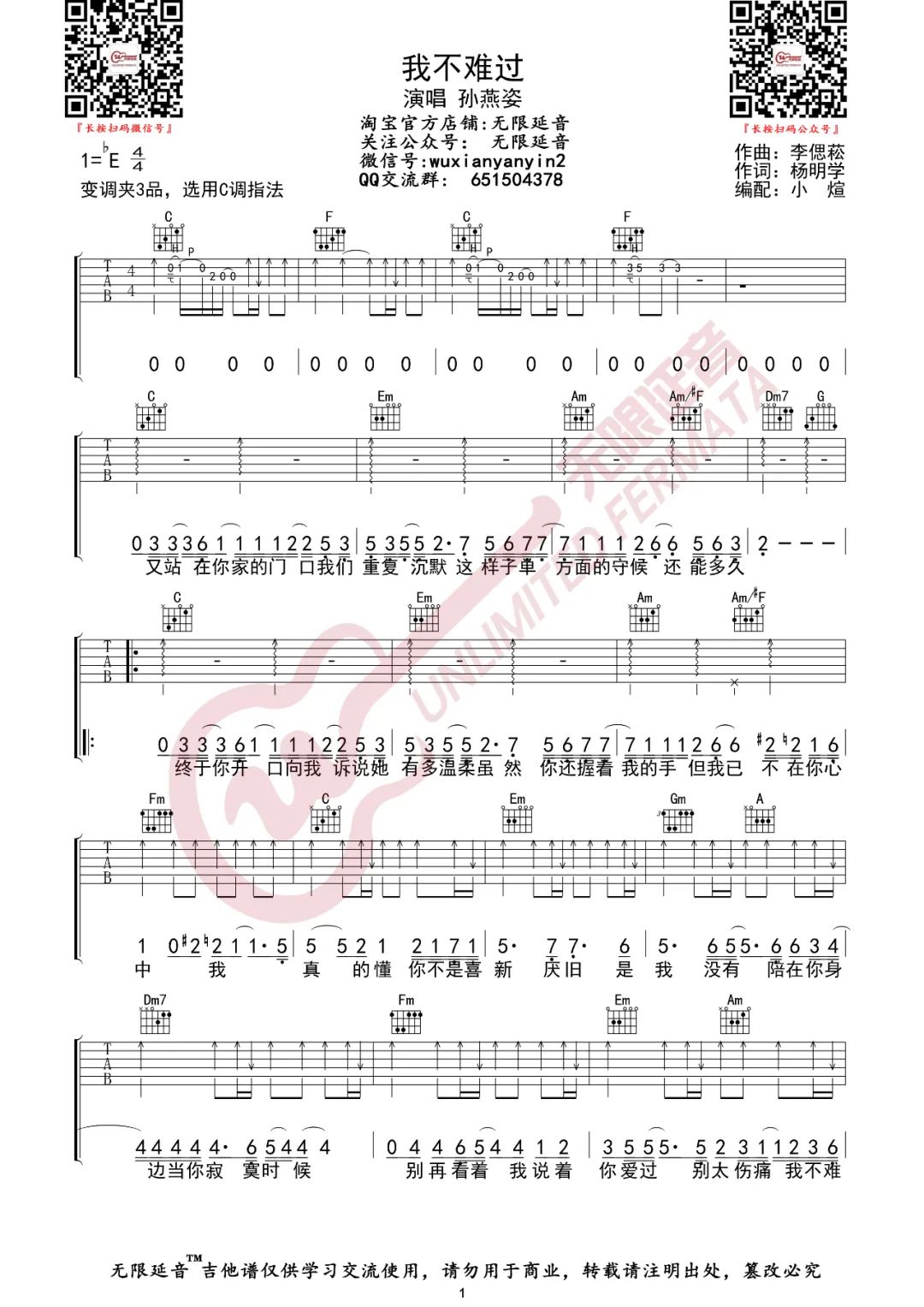 曲谱介绍: 孙燕姿《我不难过》吉他弹唱谱,采用C调指法编配原版,共有3张高清图谱。