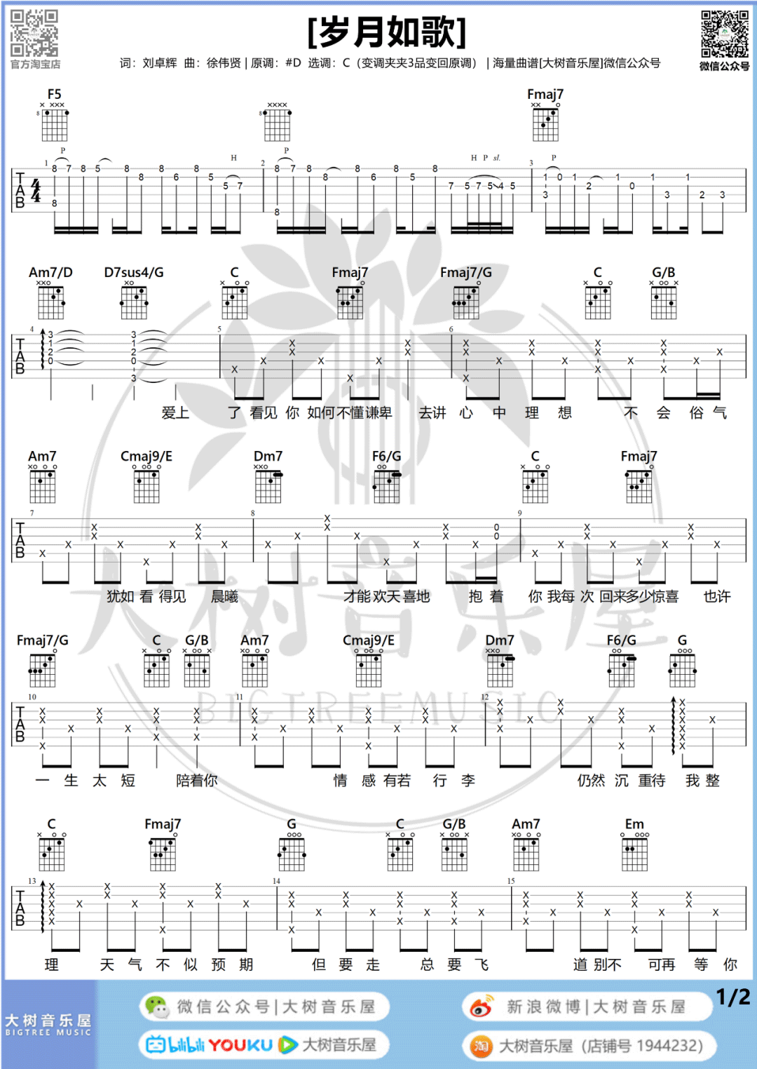 曲谱介绍: 陈奕迅《岁月如歌》吉他弹唱谱,采用C调指法编配原版,共有2张高清图谱,免翻页排版设计。