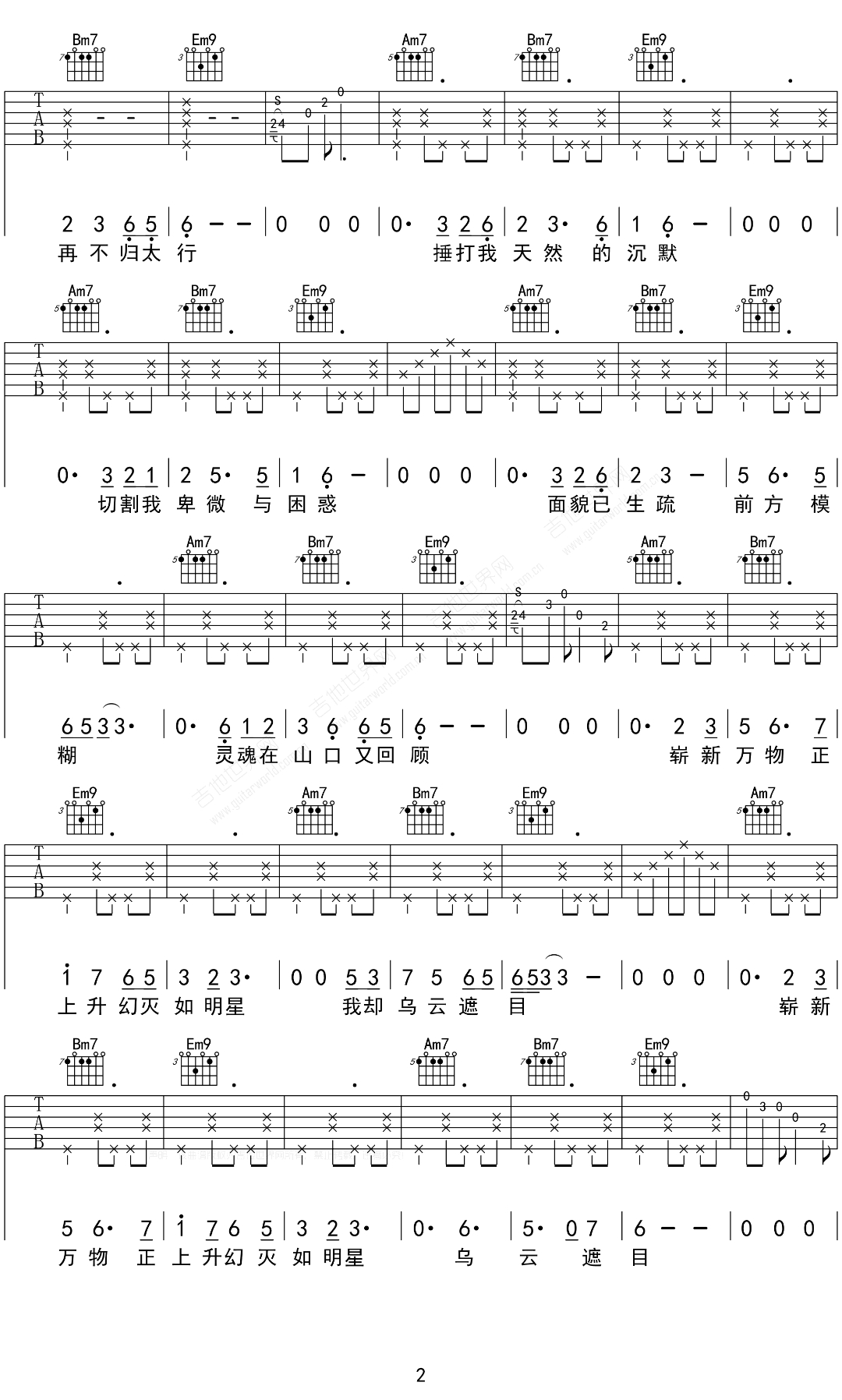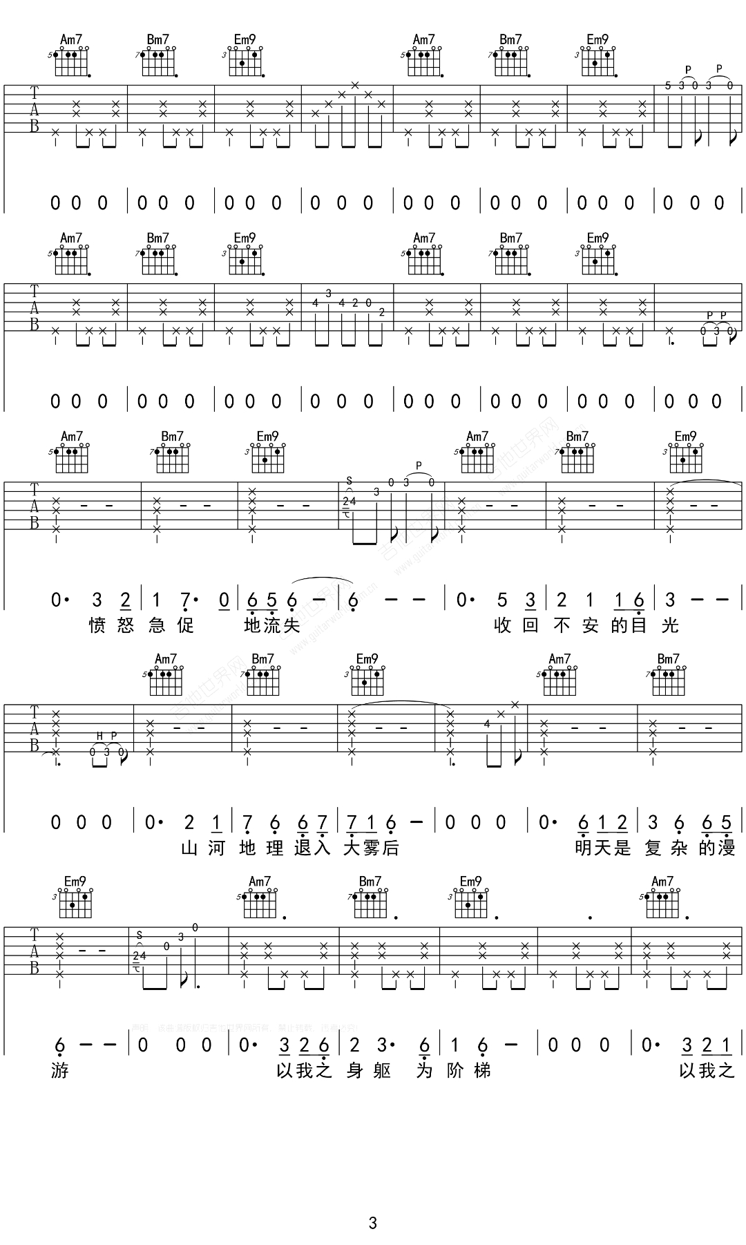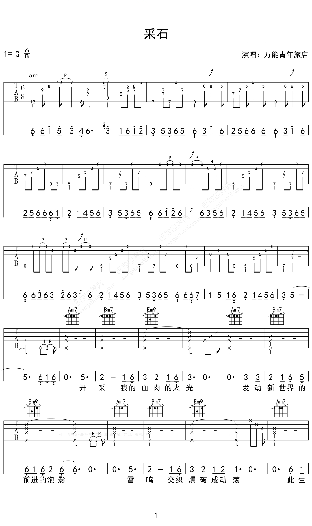 曲谱介绍: 万能青年旅店《采石》吉他弹唱谱,采用G调指法编配原版,共有5张高清图谱。