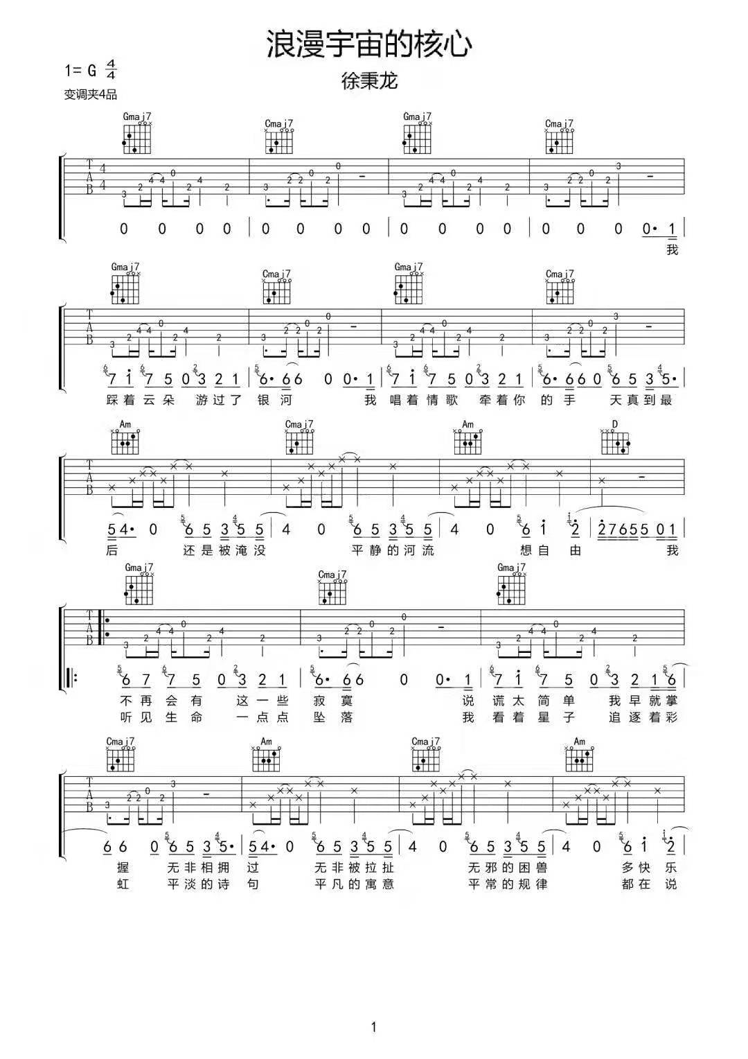 曲谱介绍: 徐秉龙《浪漫宇宙的核心》吉他弹唱谱,采用G调指法编配原版,共有3张高清图谱。