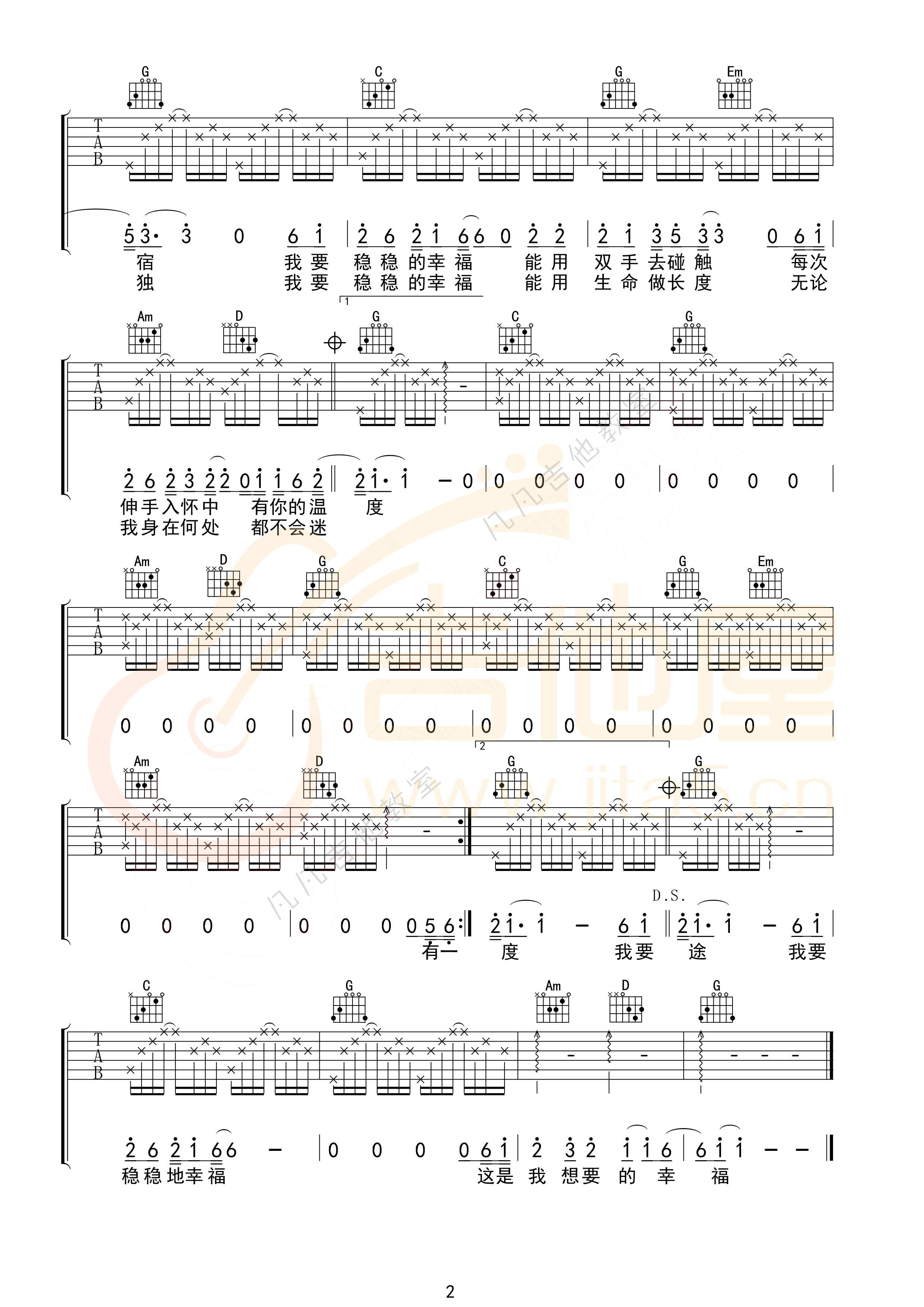 曲谱介绍: 陈奕迅《稳稳的幸福》吉他弹唱谱,采用G调指法编配,共有2张高清图谱,免翻页排版设计。
