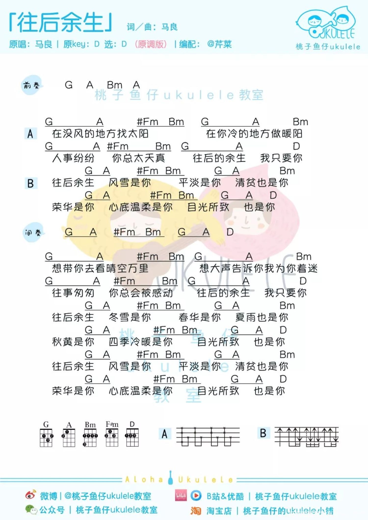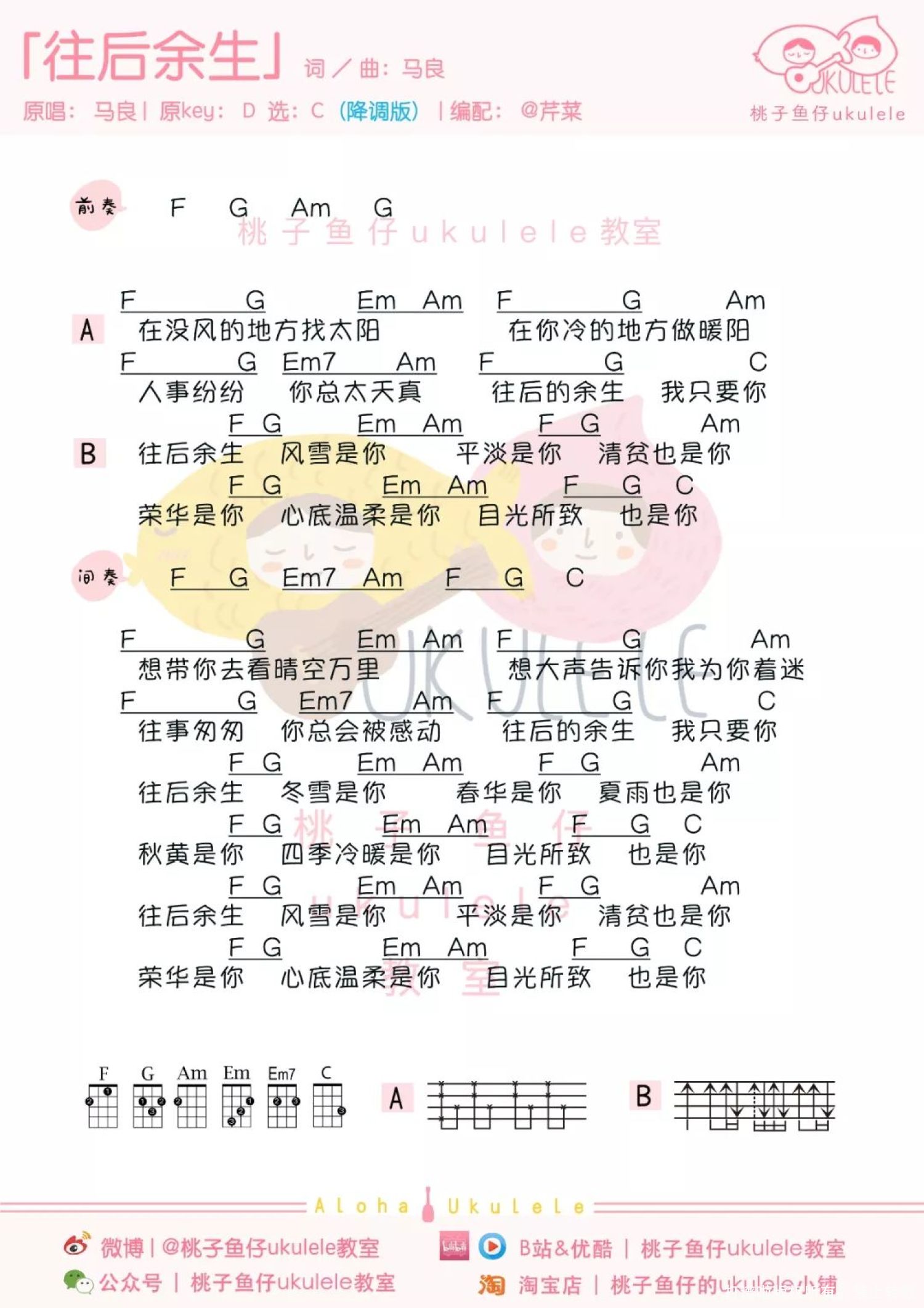 曲谱介绍: 余生很长,一起过吧。 朝霞我们一起看,夕阳我们也要一起看。 这段时间,朋友圈被《往后余生》这首歌刷屏。我也特别喜欢它的歌词,往后余生都是你,很甜很暖的表白和承诺,直达心底。 往后余生这首歌,有两个歌手唱过(分别是:何小渝、马良)。 何小渝的歌曲名称叫做:《往后余生》 马良的歌曲名称叫做:《往后余生原创(demo)》   尤克里里弹唱教学   尤克里里谱 1. 降调C调版   2. 原调D调版