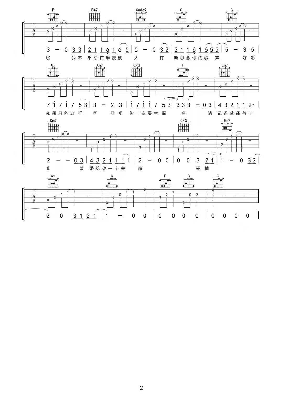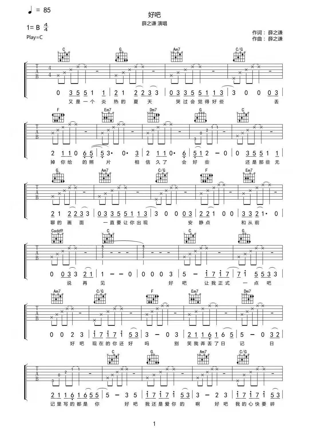 曲谱介绍: 薛之谦《好吧》吉他弹唱谱,采用C调指法编配,共有2张高清图谱,免翻页排版设计。