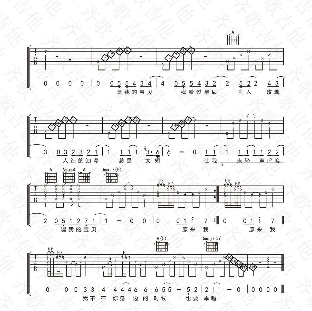 曲谱介绍: 徐秉龙《宝贝》吉他弹唱谱,采用D调指法编配原版,共有3张高清图谱。