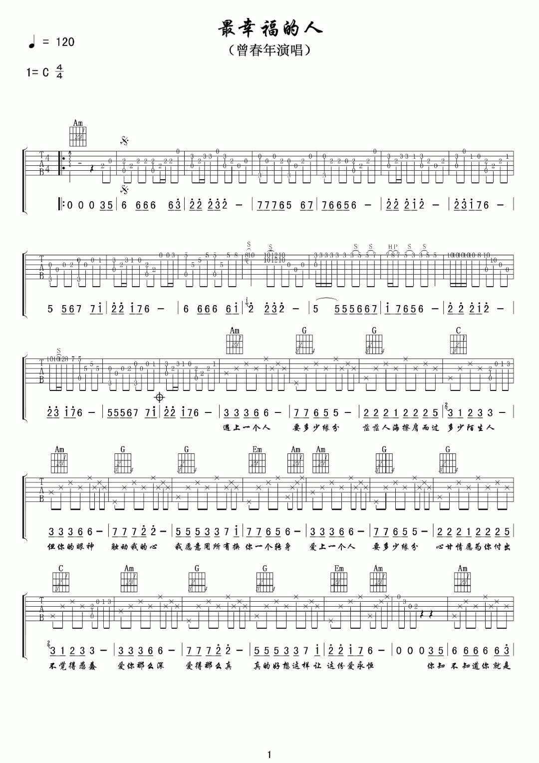 最幸福的人吉他谱 - 曾春年 - C调吉他弹唱谱 - 原版