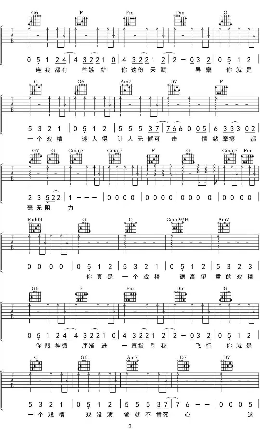 曲谱介绍: 徐秉龙《戏精》吉他弹唱谱,采用C调指法编配原版,共有4张高清图谱。