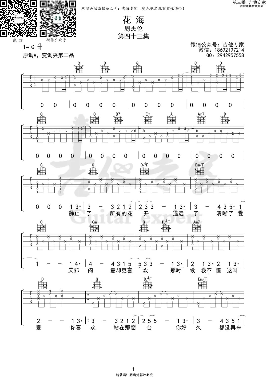 曲谱介绍: 周杰伦《花海》吉他弹唱谱,采用G调指法编配原版,共有3张高清图谱。