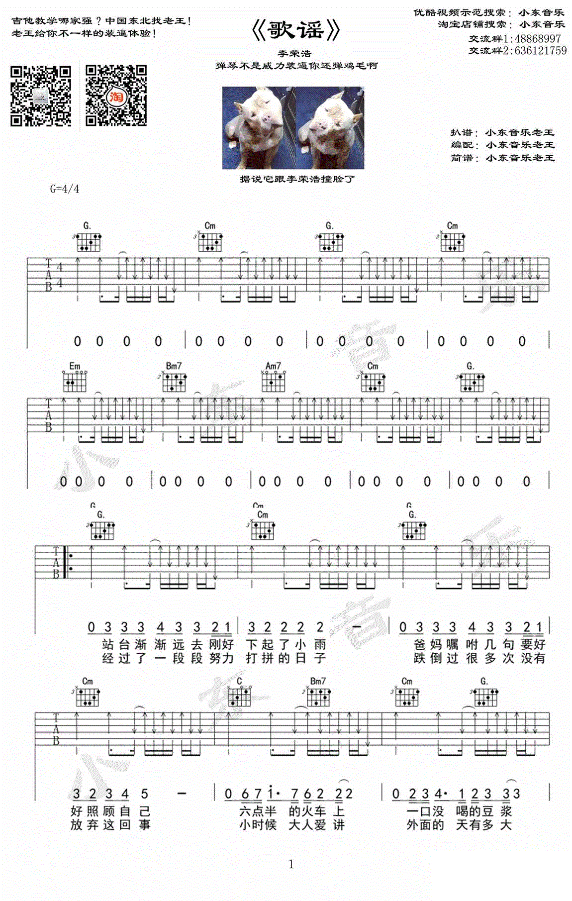 曲谱介绍: 李荣浩《歌谣》吉他弹唱谱,采用G调指法编配,共有4张高清图谱。