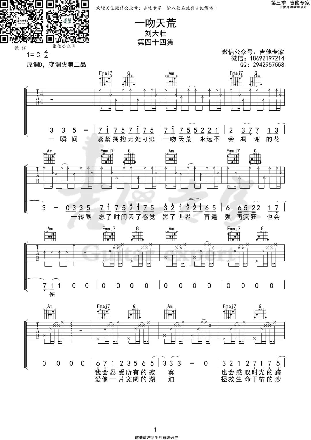 曲谱介绍: 刘大壮《一吻天荒》吉他弹唱谱,采用C调指法编配原版,共有3张高清图谱。