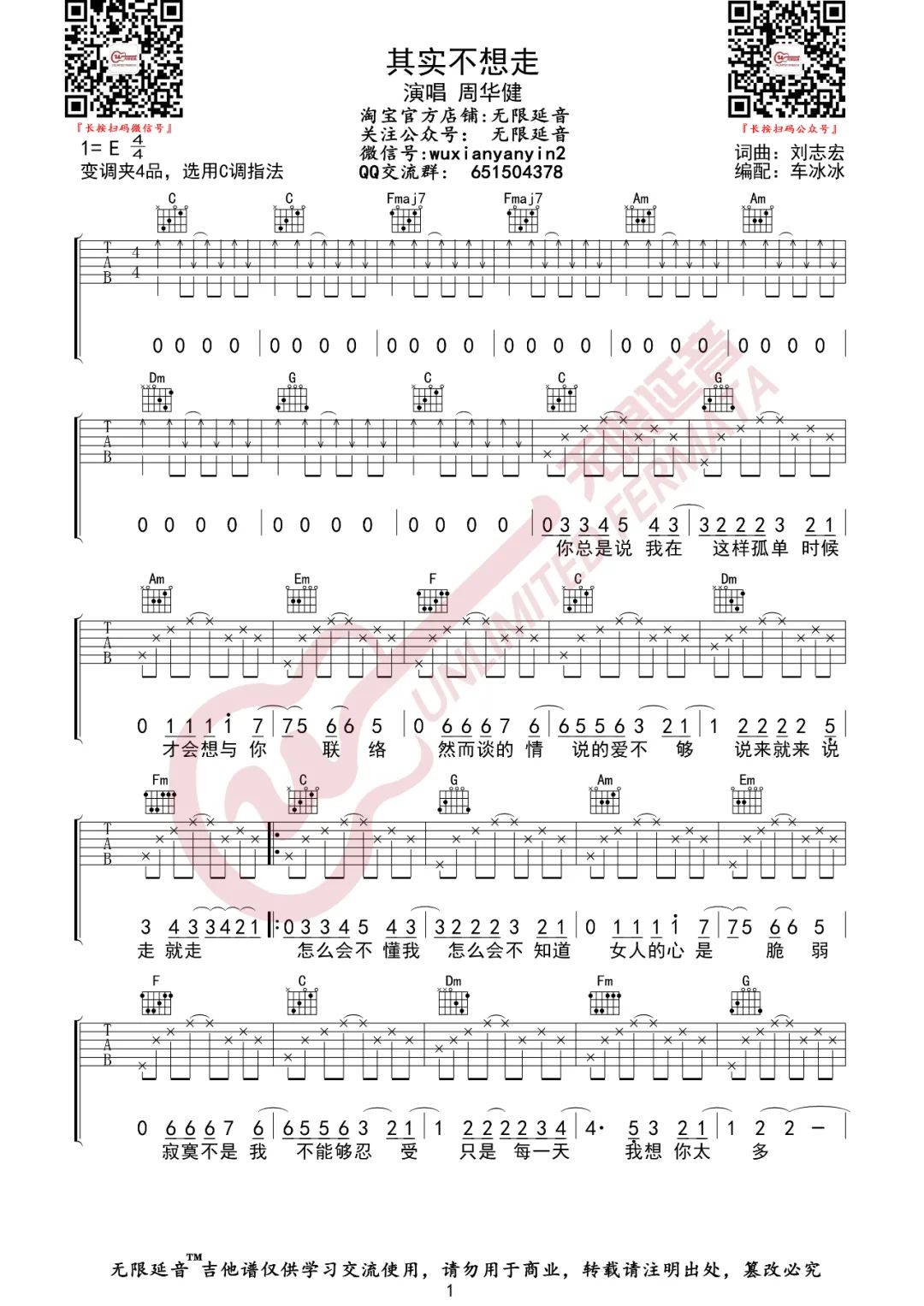 曲谱介绍: 周华健《其实不想走》吉他弹唱谱,采用C调指法编配,共有2张高清图谱,免翻页排版设计。