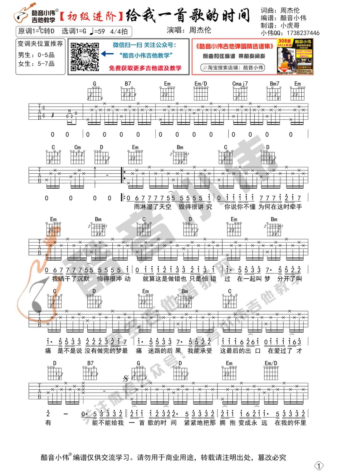 曲谱介绍: 周杰伦《给我一首歌的时间》吉他弹唱谱,采用G调指法编配,共有1张高清图谱,免翻页排版设计。