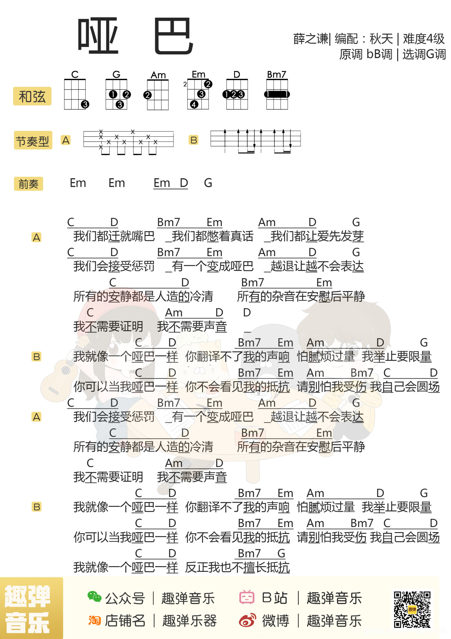 曲谱介绍: 《哑巴》尤克里里谱   最近薛之谦在节目《无限歌谣祭》 带来了一首新歌《哑巴》 即使头戴小岳岳面具很抢戏 但依旧不影响他唱歌时的投入 这首歌原唱是他的好友刘维 经过薛之谦的二次创作 带上了独一无二的薛式情歌风格 歌曲开头温柔而细腻的钢琴弹奏 第一时间将听歌的人紧紧抓牢 薛之谦在音乐上的坚持 也真的是独一无二的