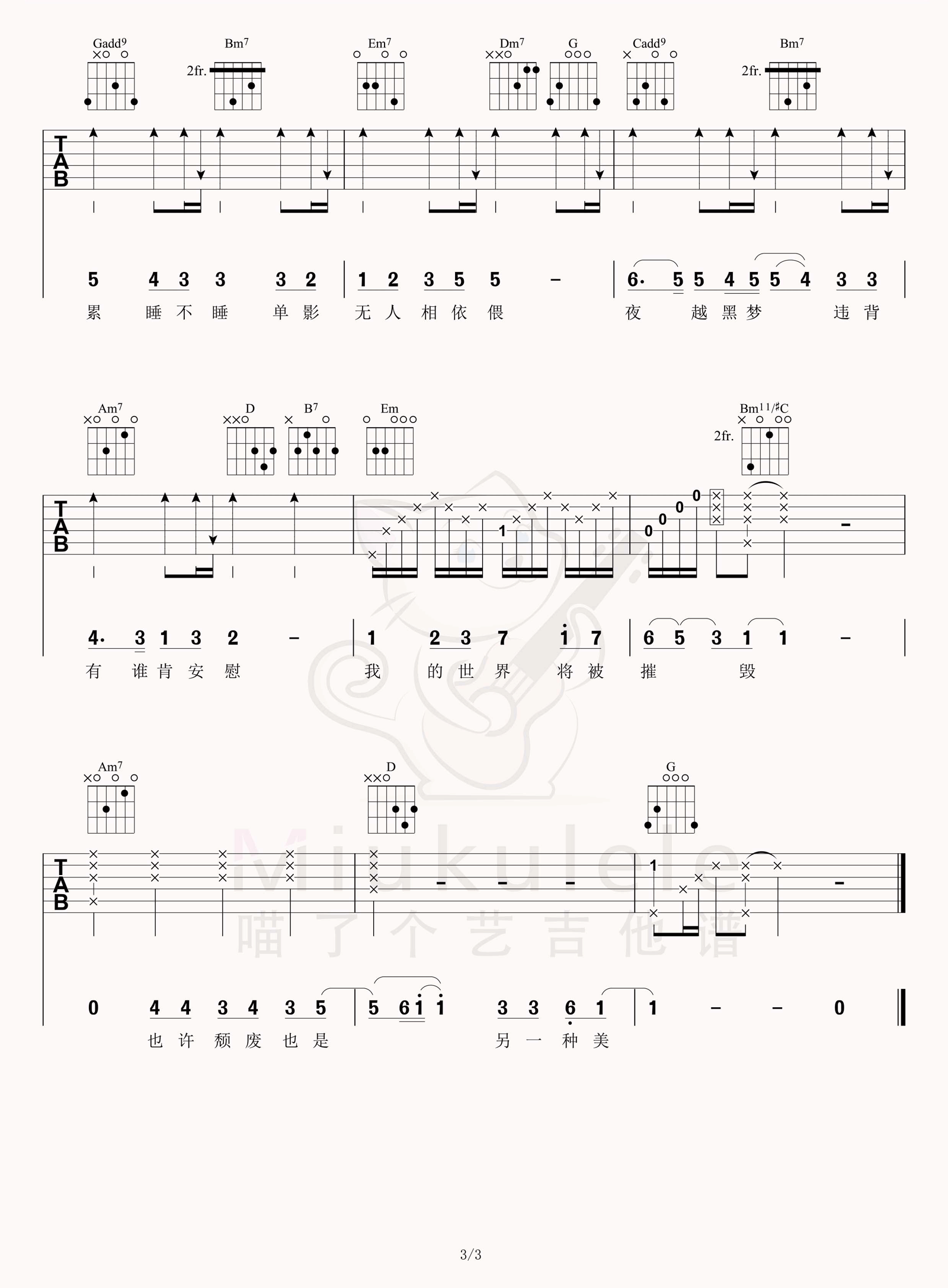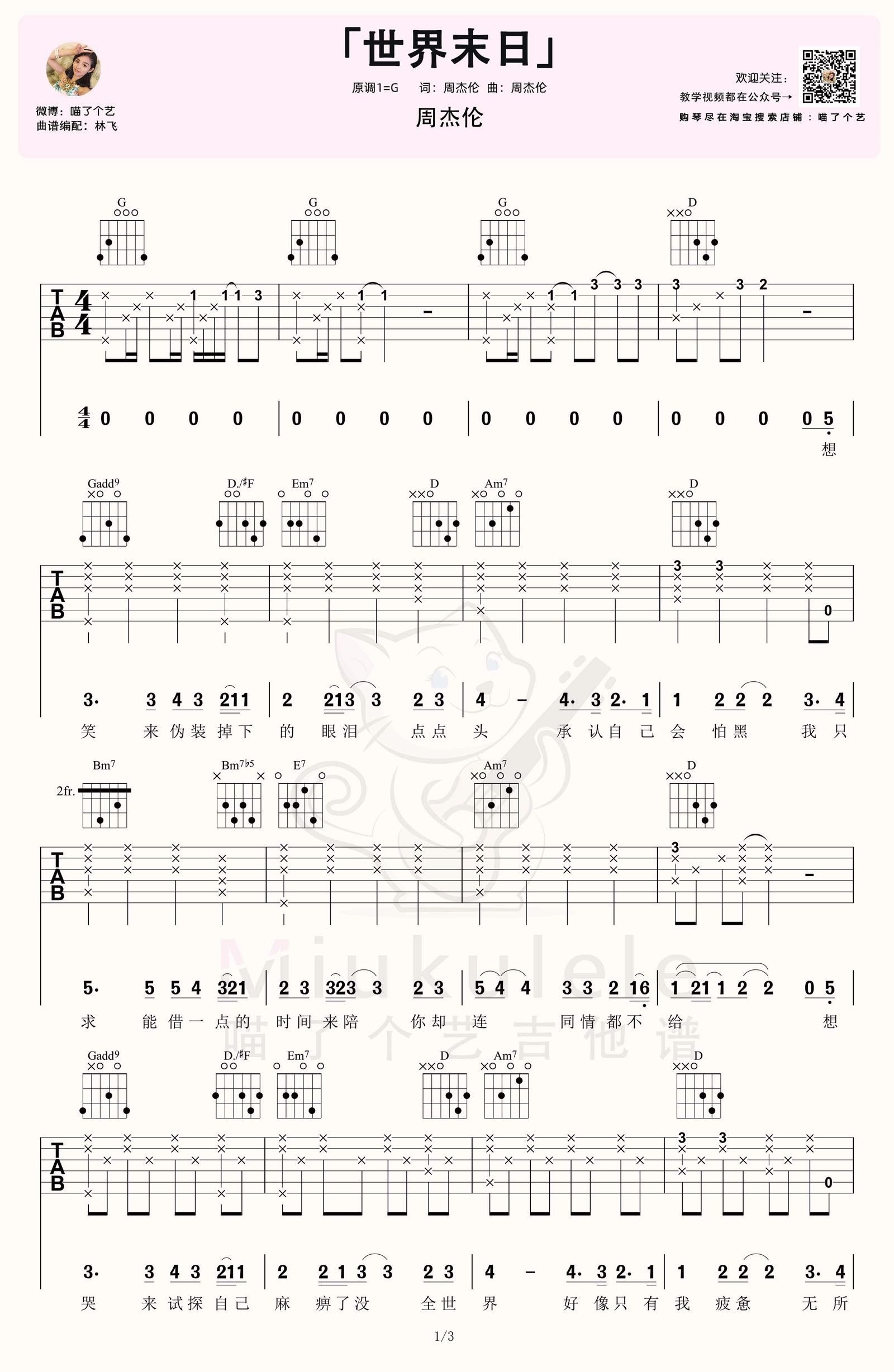 曲谱介绍: 周杰伦《世界末日》吉他弹唱谱,采用G调指法编配原版,共有3张高清图谱。
