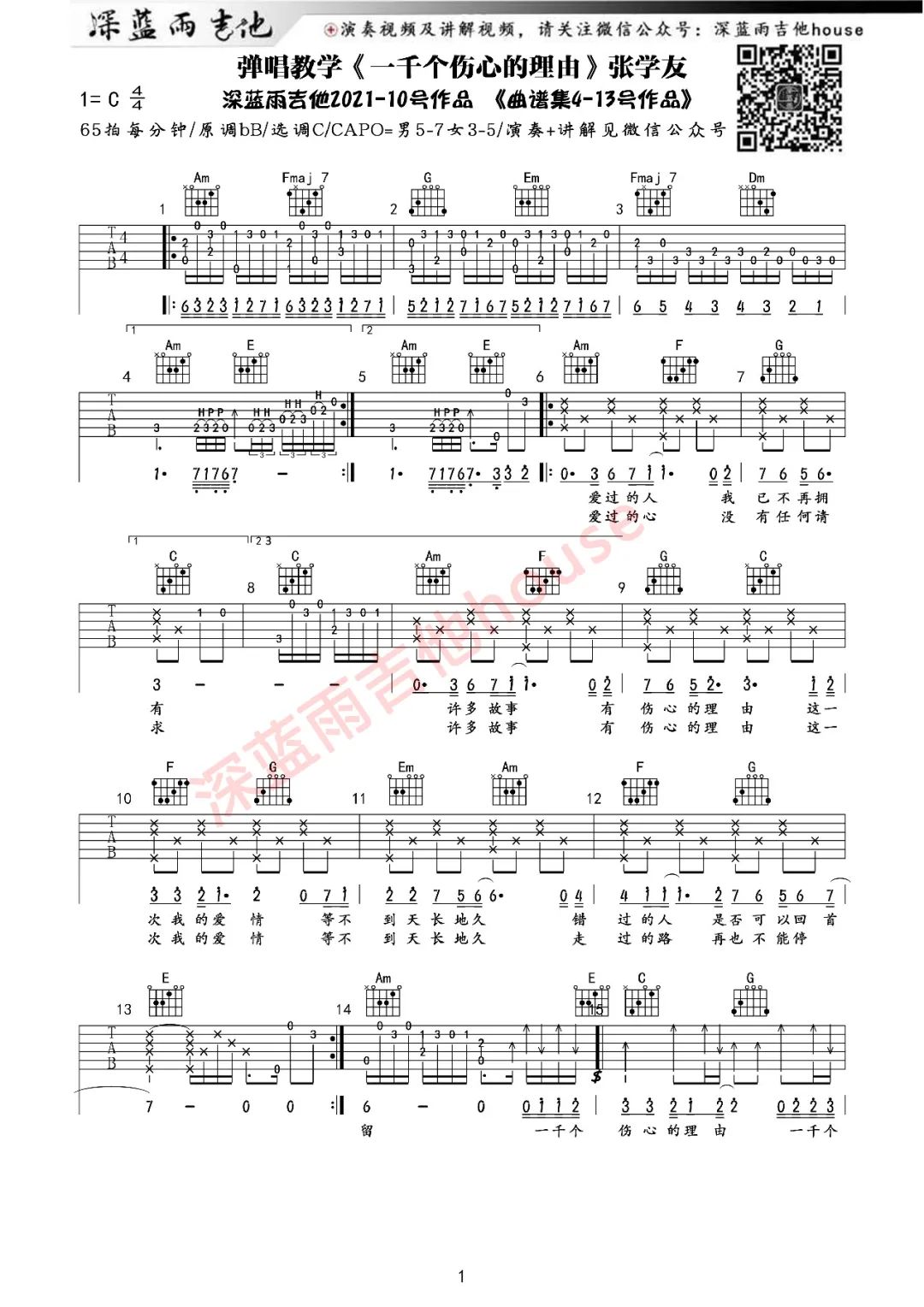 曲谱介绍: 张学友《一千个伤心的理由》吉他弹唱谱,采用C调指法编配,共有2张高清图谱,免翻页排版设计。