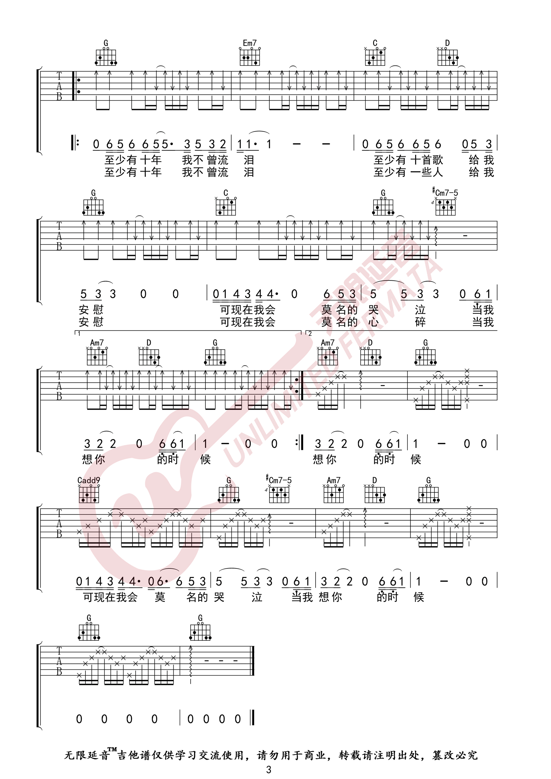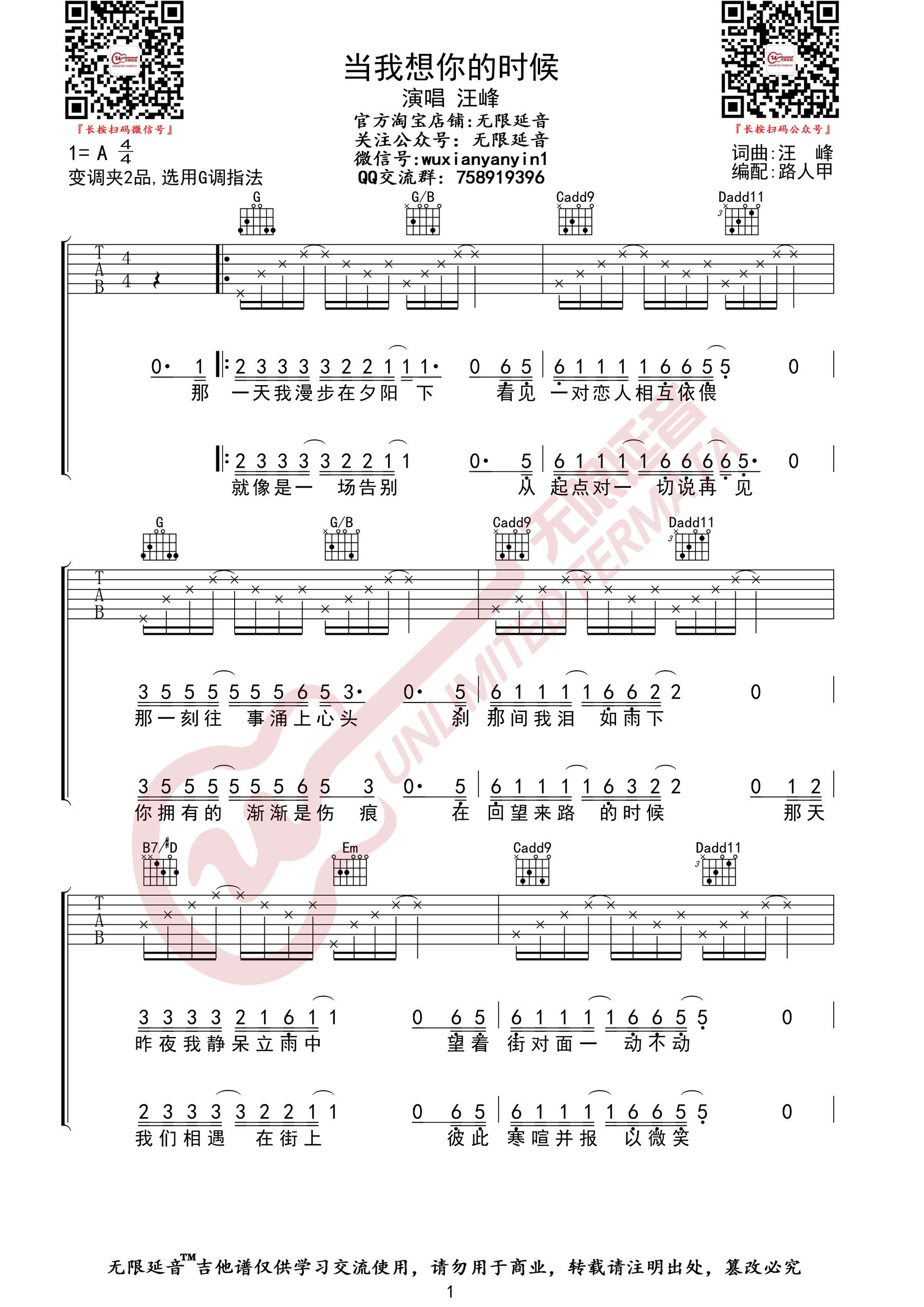 曲谱介绍: 汪峰《当我想你的时候》吉他弹唱谱,采用G调指法编配原版,共有3张高清图谱。
