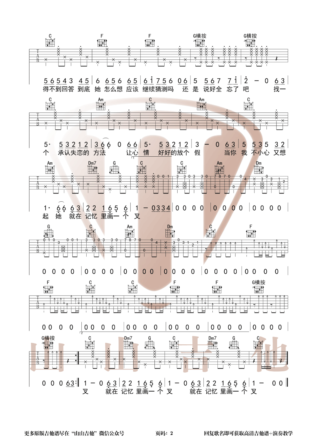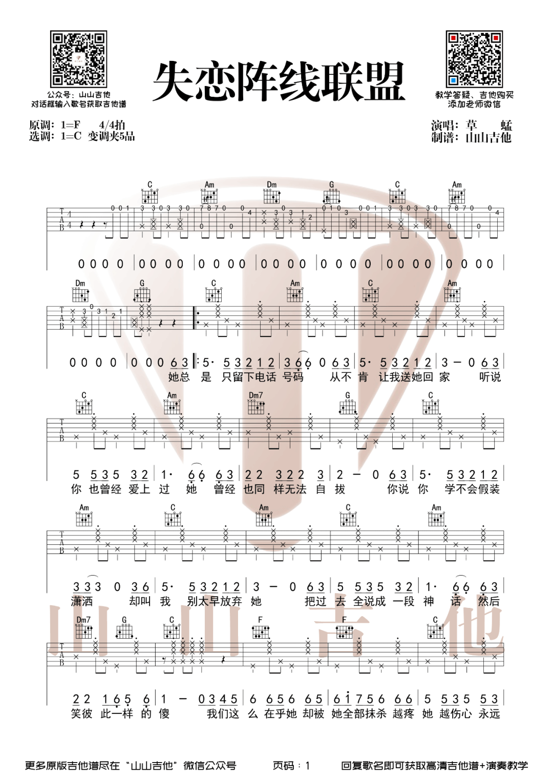 曲谱介绍: 草蜢《失恋阵线联盟》吉他弹唱谱,采用C调指法编配,共有2张高清图谱,免翻页排版设计。