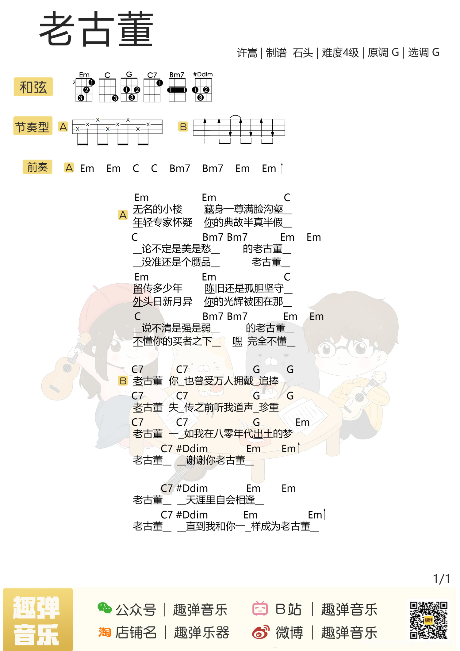 曲谱介绍: 《老古董》尤克里里弹唱谱 没错,一直佛系出歌的许嵩前几天又发新歌了,俨然一副要成为劳模的样子。《老古董》新歌发布选在了5月14日,他生日当天。 看到歌名,很多人想吐槽:许嵩这是在说自己吗?可是他又不老!然而这副冒充小哥哥也不会有人发现的脸蛋,今年已经32岁了。 新歌依旧由他亲自作词作曲,演唱技巧也更加娴熟,在歌里似乎能听出他淡淡的自我吐槽: 不论从词曲还是编曲,在很多粉丝心里,这或许是许嵩最内涵深刻也是最优秀的一首歌。