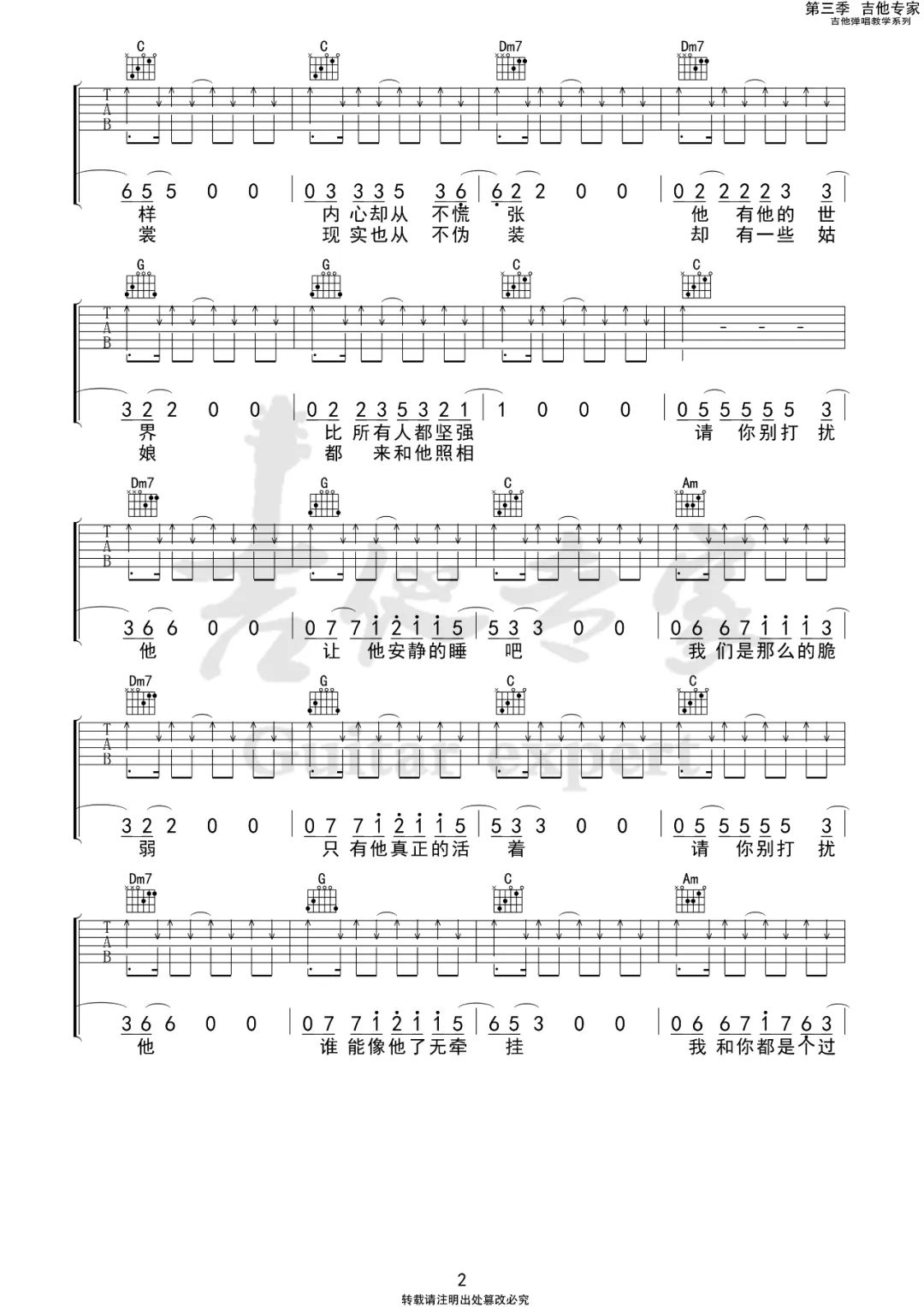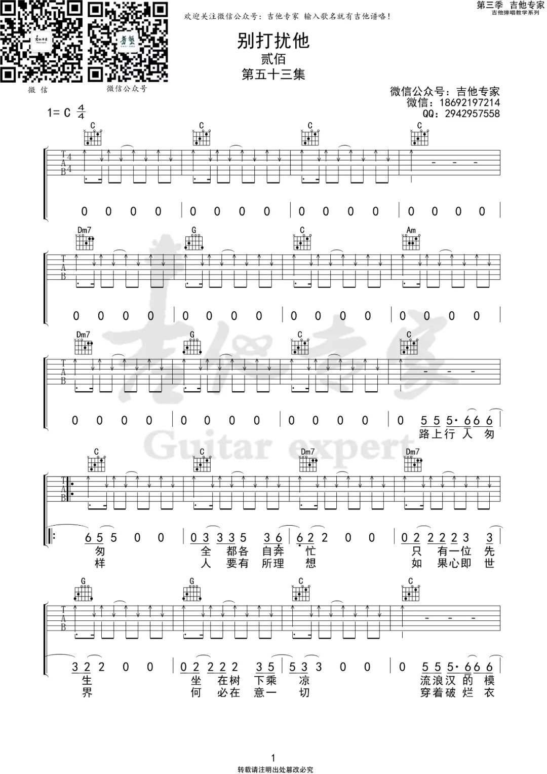 曲谱介绍: 贰佰《别打扰他》吉他弹唱谱,采用C调指法编配,共有3张高清图谱。