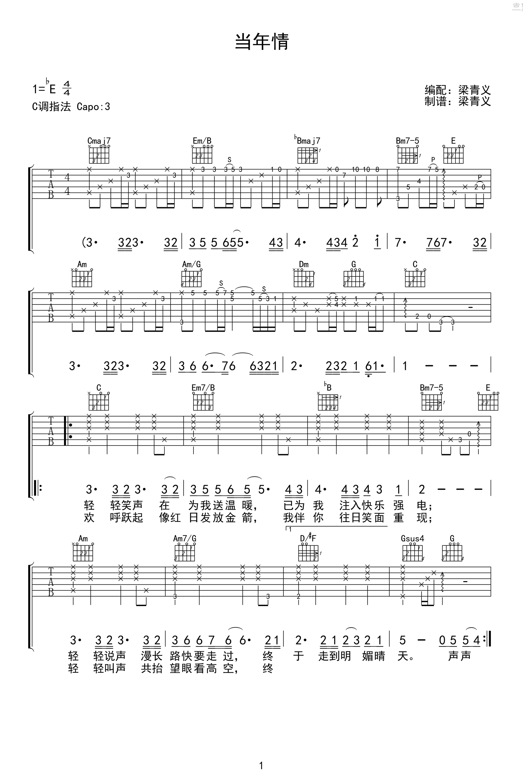曲谱介绍: 张国荣《当年情》吉他弹唱谱,采用C调指法编配原版,共有3张高清图谱。