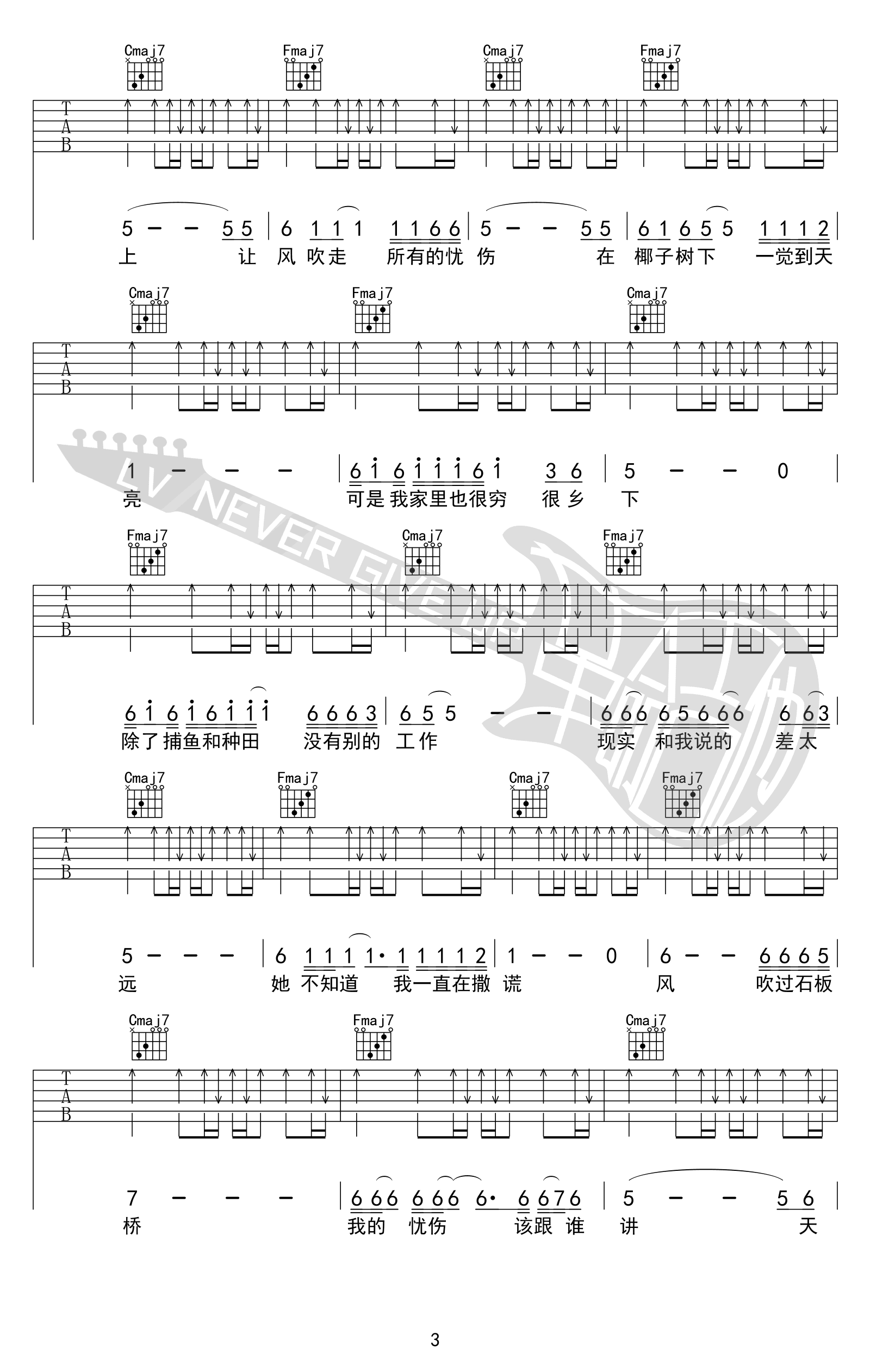 曲谱介绍: 五条人《梦幻丽莎发廊》吉他弹唱谱,采用C调指法编配原版,共有4张高清图谱。