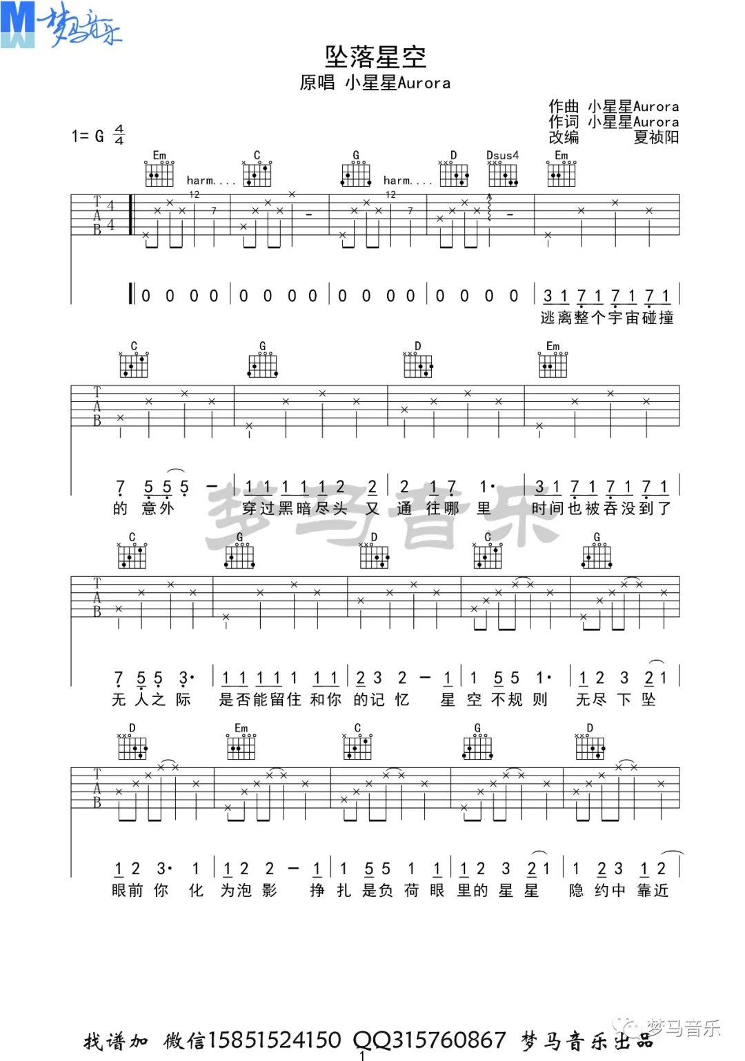 曲谱介绍: 小星星Aurora《坠落星空》吉他弹唱谱,采用G调指法编配,共有2张高清图谱,免翻页排版设计。
