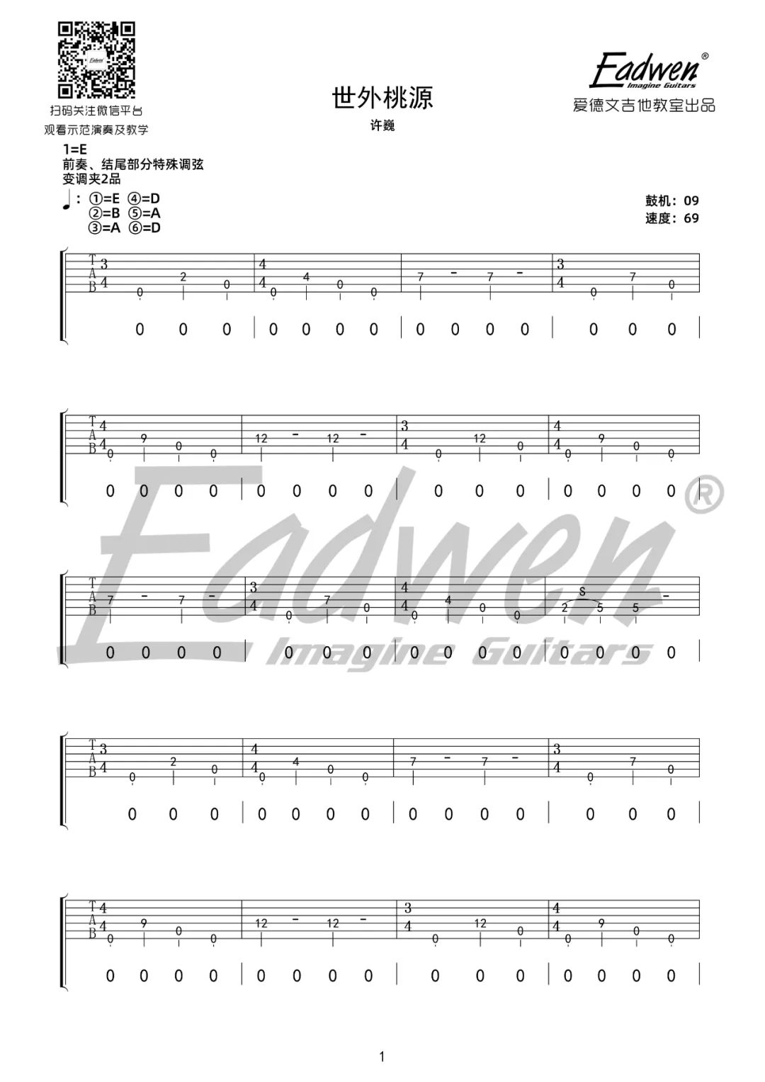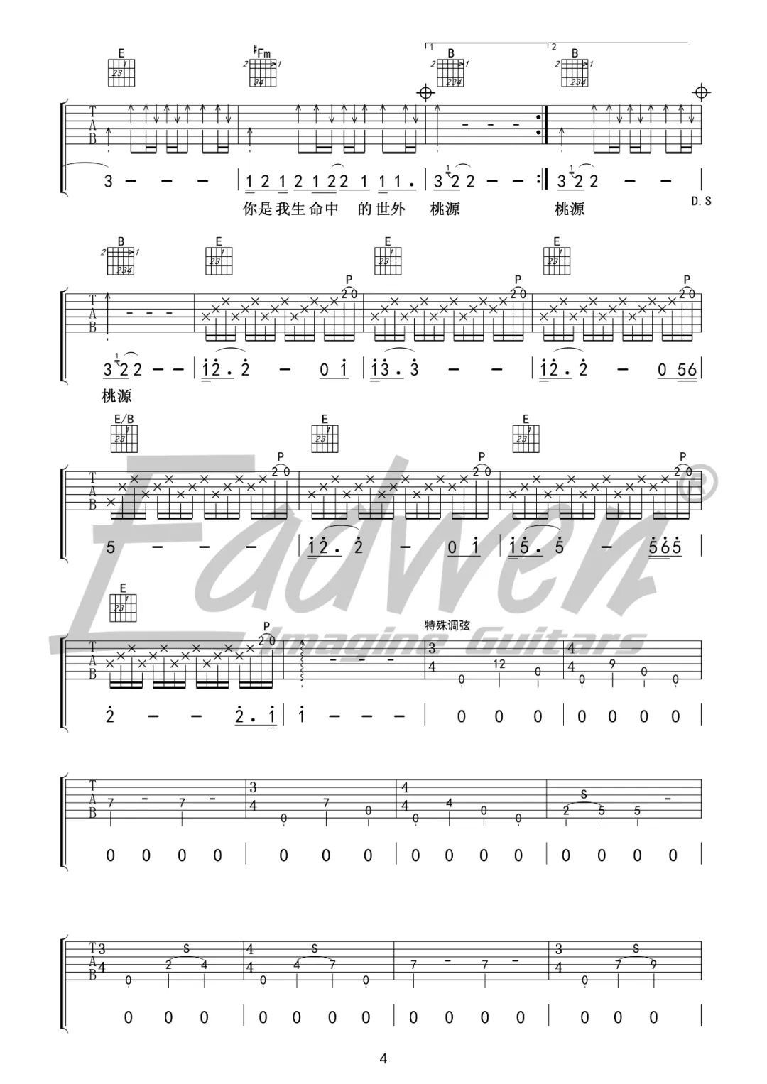 曲谱介绍: 许巍《世外桃源》吉他弹唱谱,采用E调指法编配原版,共有5张高清图谱。