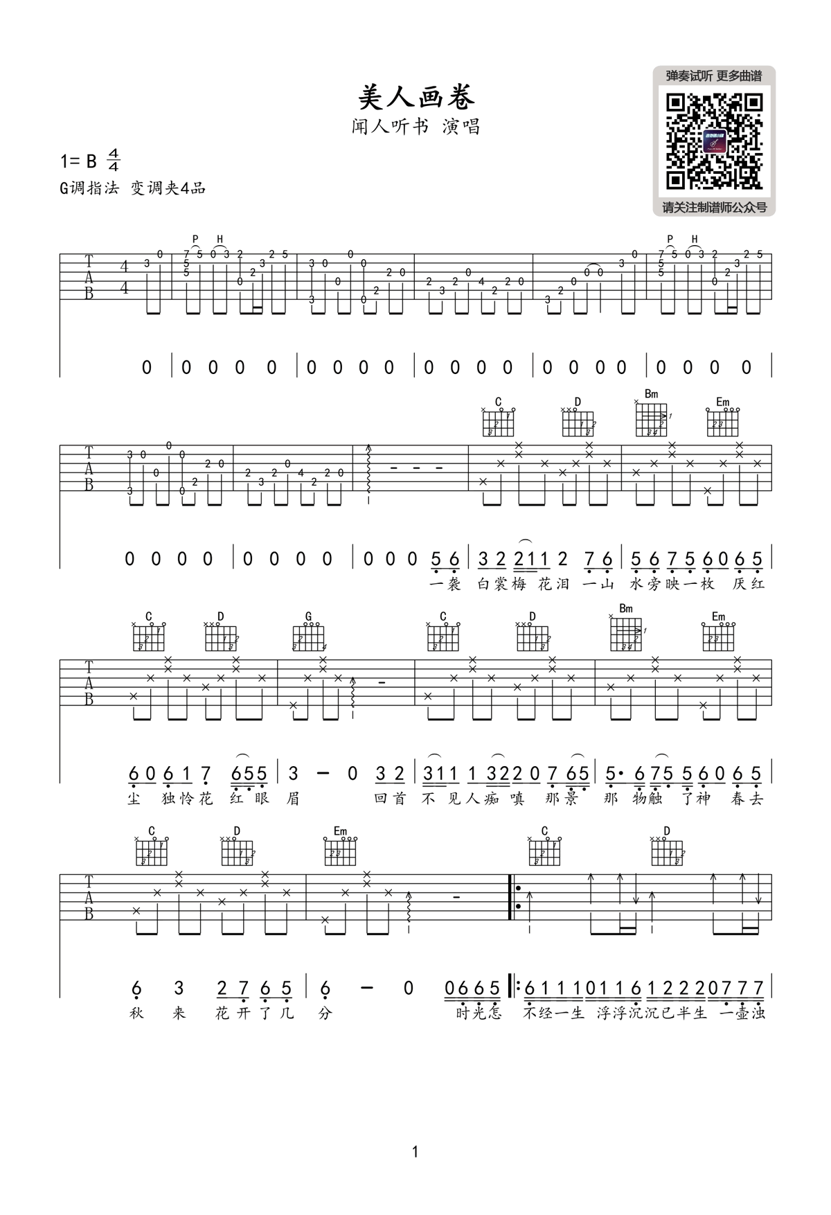 曲谱介绍: 闻人听书《美人画卷》吉他弹唱谱,采用G调指法编配原版,共有3张高清图谱。