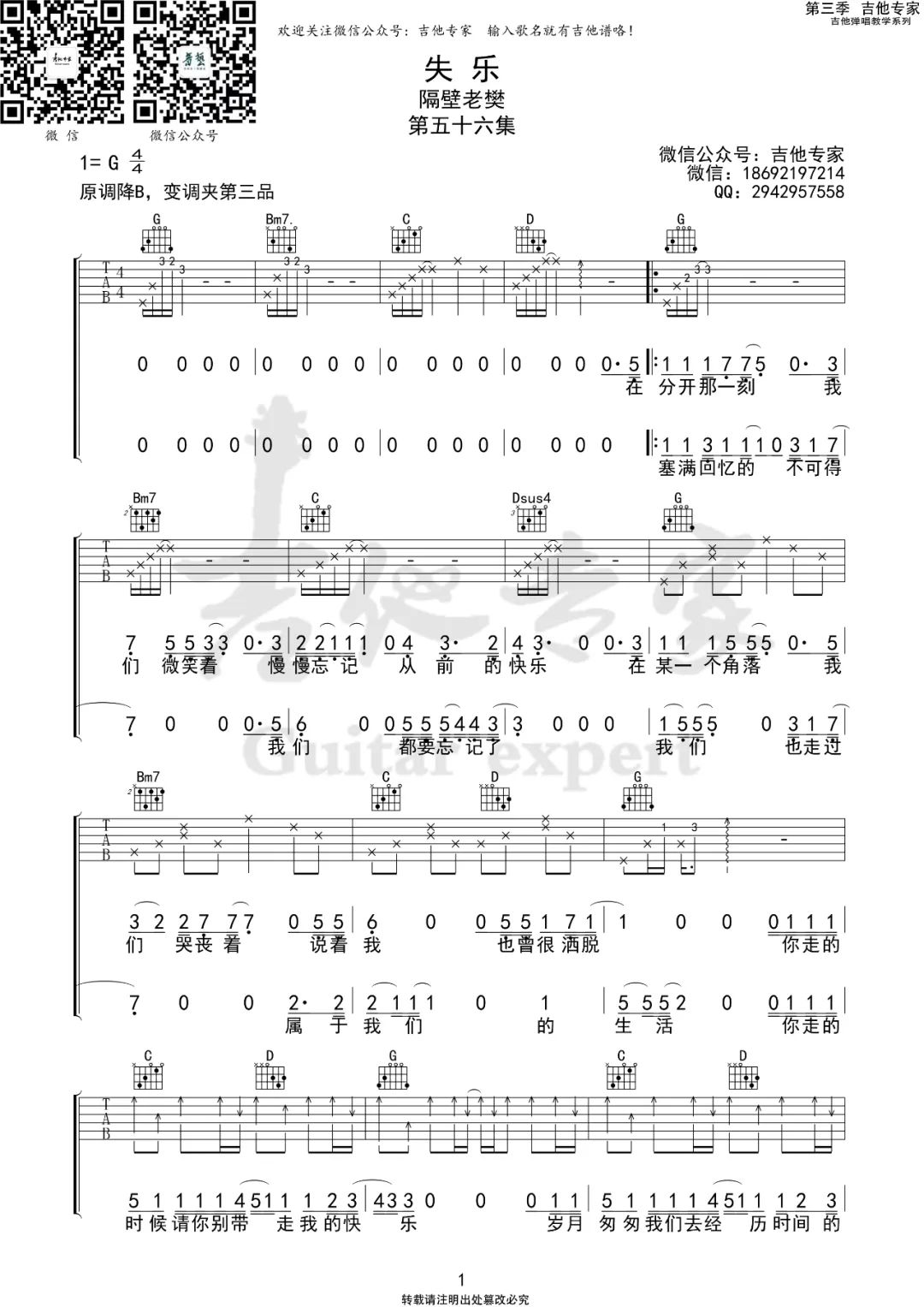 失乐吉他谱 - 隔壁老樊 - G调吉他弹唱谱 - 原版