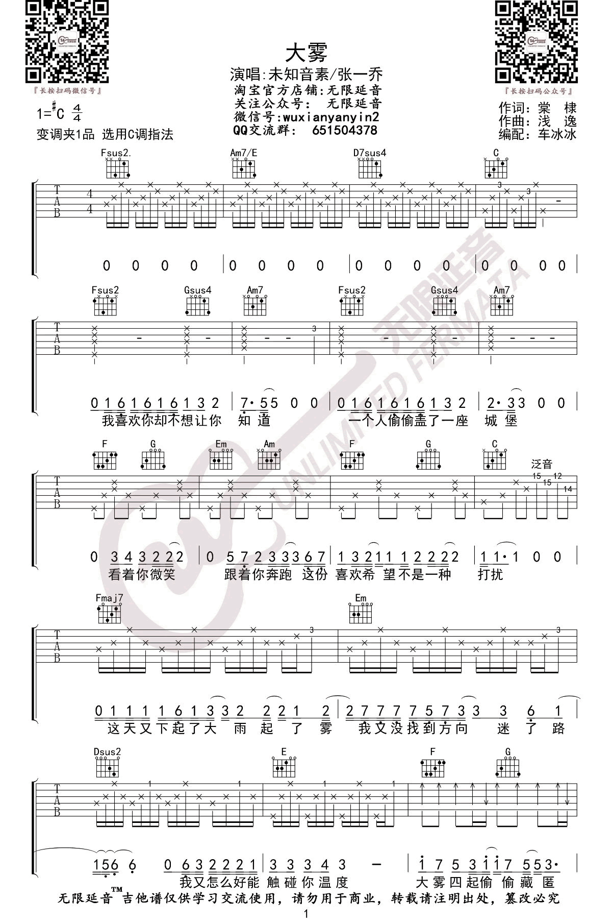 曲谱介绍: 未知音素/张一乔《大雾》吉他弹唱谱,采用C调指法编配,共有2张高清图谱,免翻页排版设计。