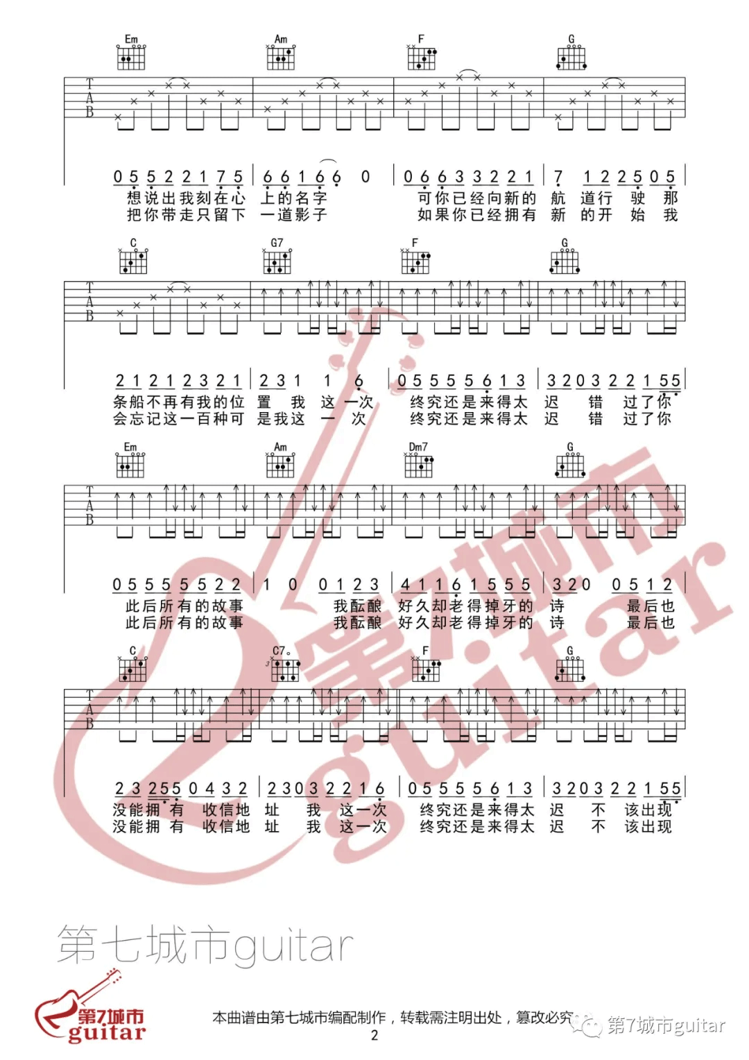曲谱介绍: 戴羽彤《来迟》吉他弹唱谱,采用C调指法编配原版,共有3张高清图谱。