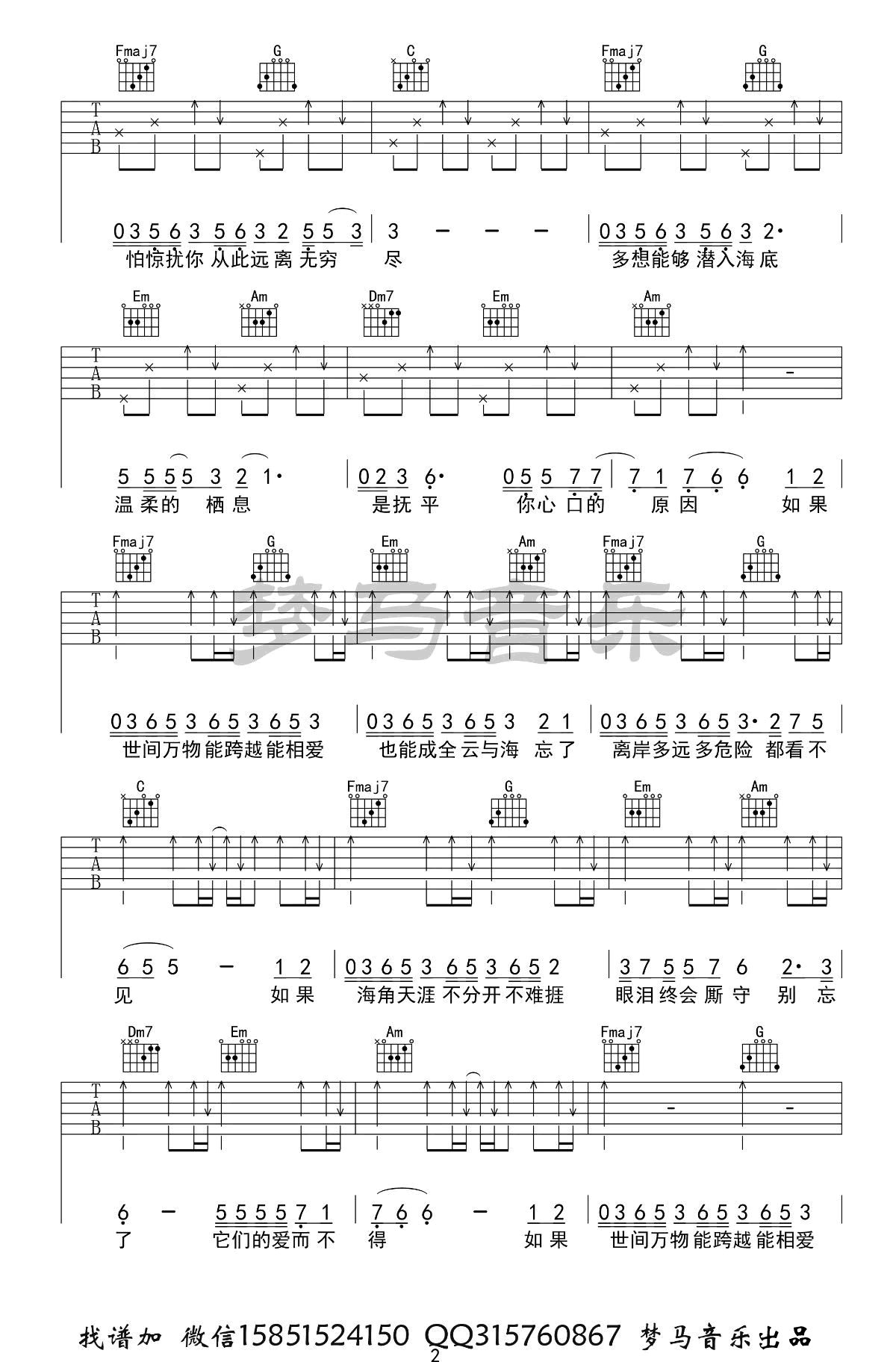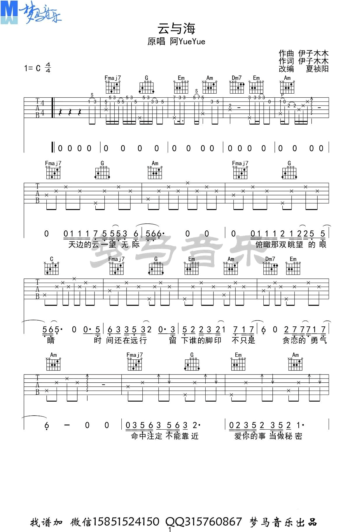 曲谱介绍: 阿YueYue《云与海》吉他弹唱谱,采用C调指法编配原版,共有3张高清图谱。