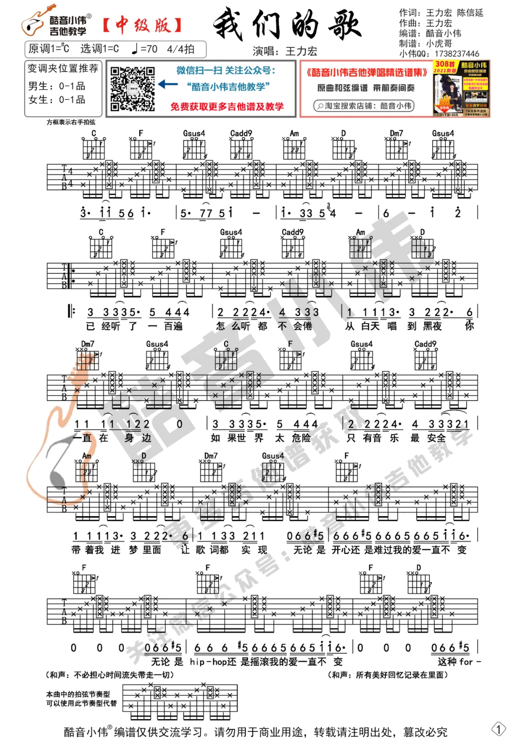 曲谱介绍: 王力宏《我们的歌》吉他弹唱谱,采用C调指法编配,共有2张高清图谱,免翻页排版设计。