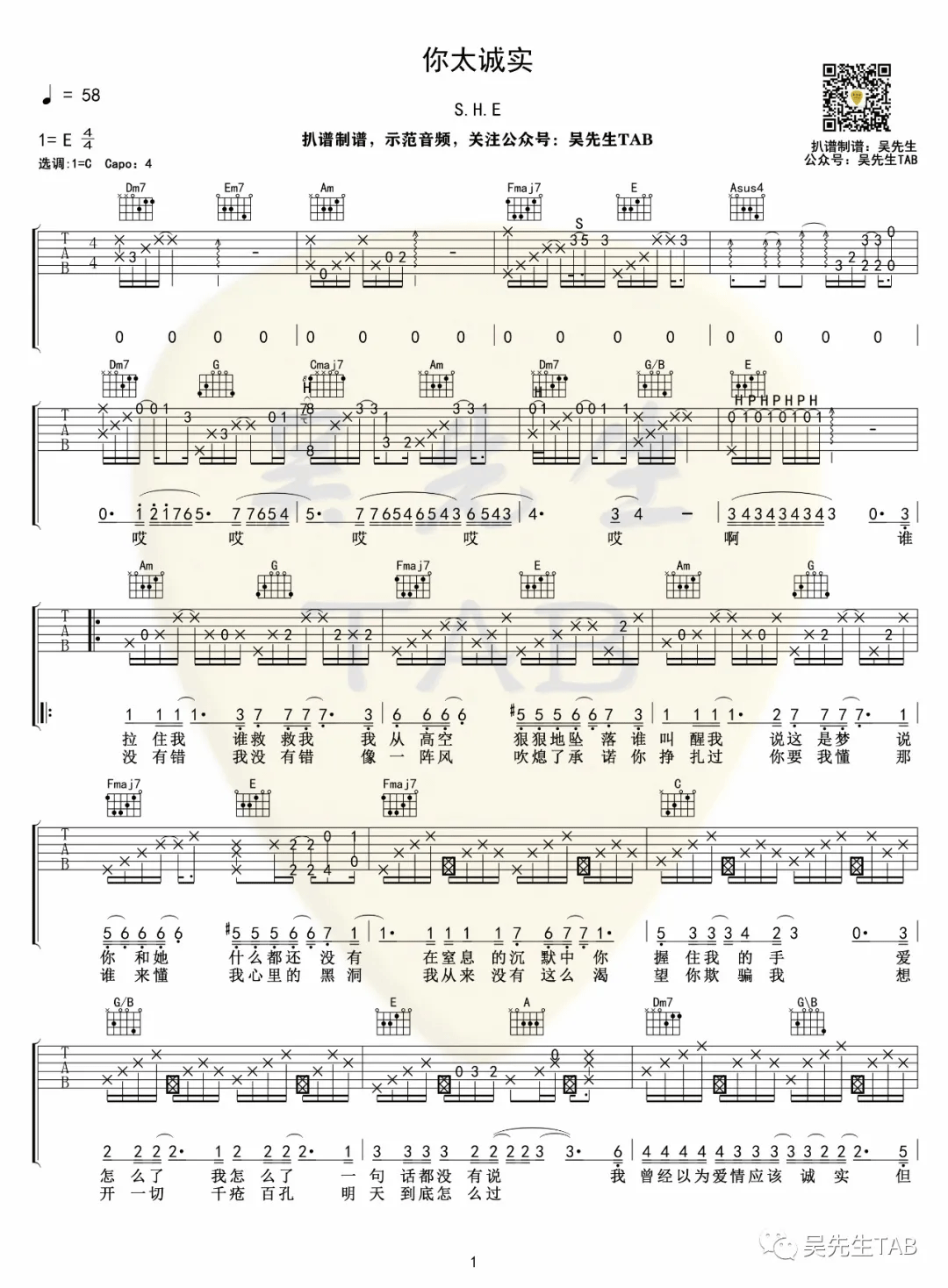 曲谱介绍: S.H.E《你太诚实》吉他弹唱谱,采用C调指法编配原版,共有3张高清图谱。