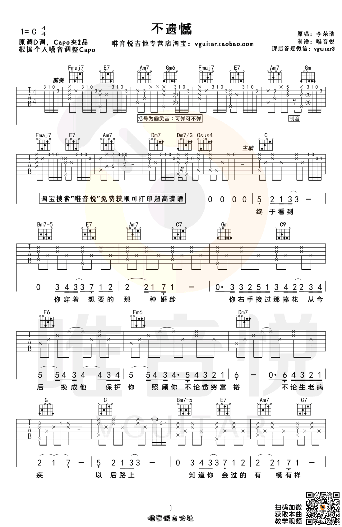 曲谱介绍: 李荣浩《不遗憾》吉他弹唱谱,采用C调指法编配原版,共有3张高清图谱。