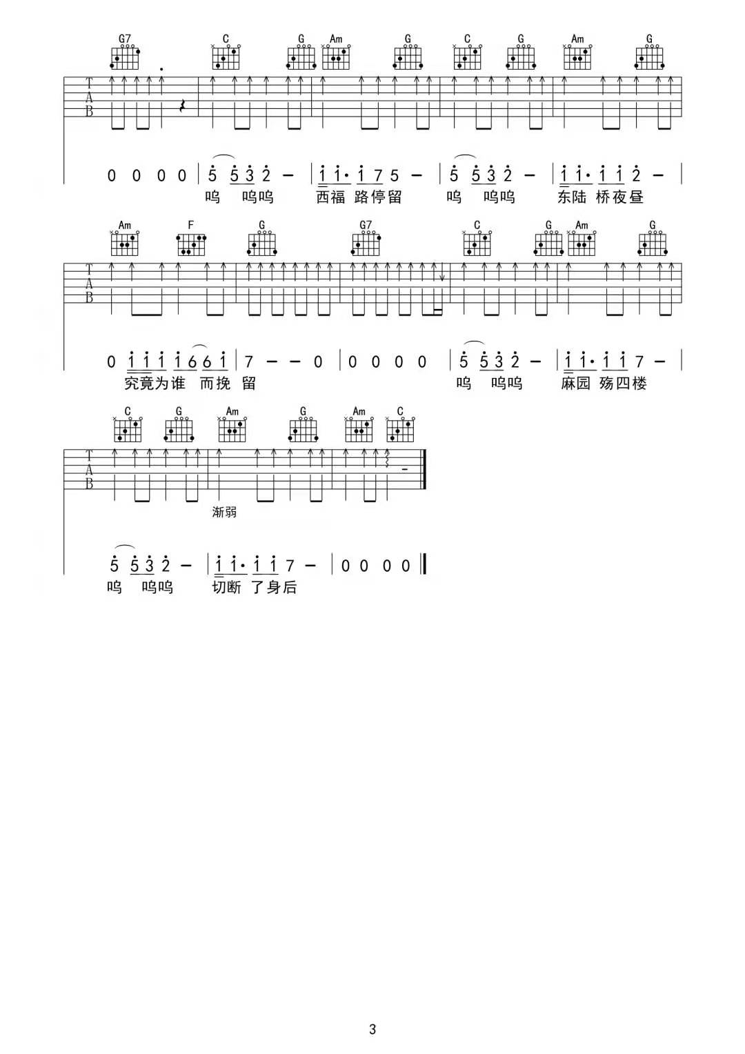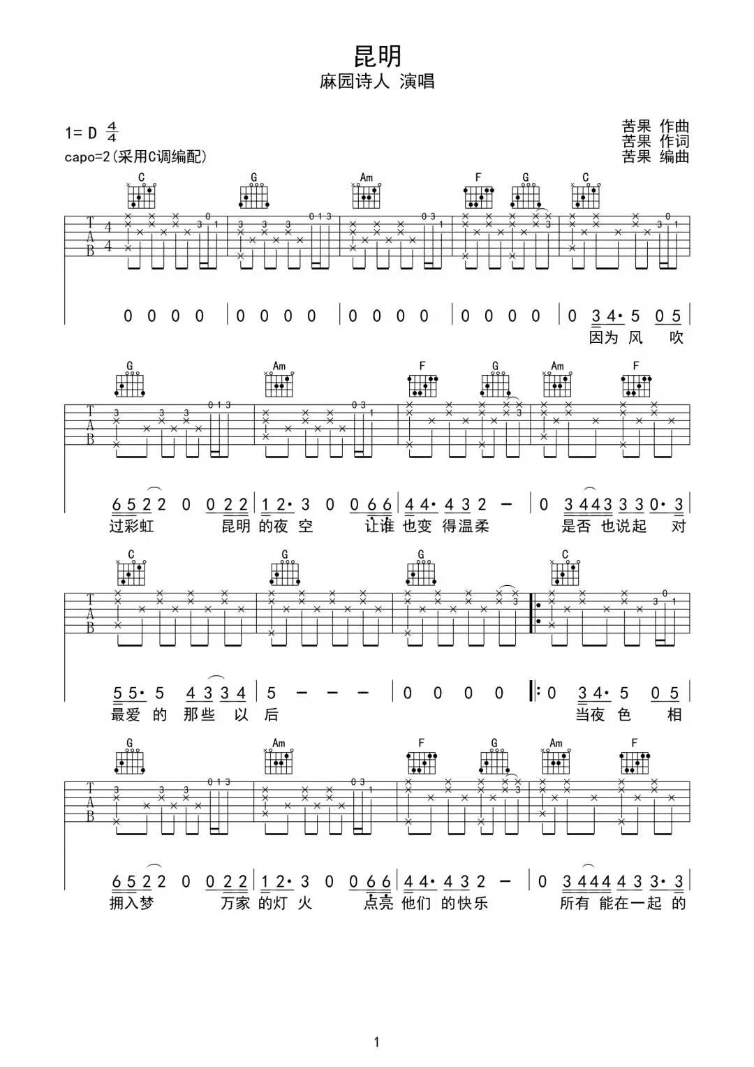 曲谱介绍: 麻园诗人《昆明》吉他弹唱谱,采用C调指法编配原版,共有3张高清图谱。