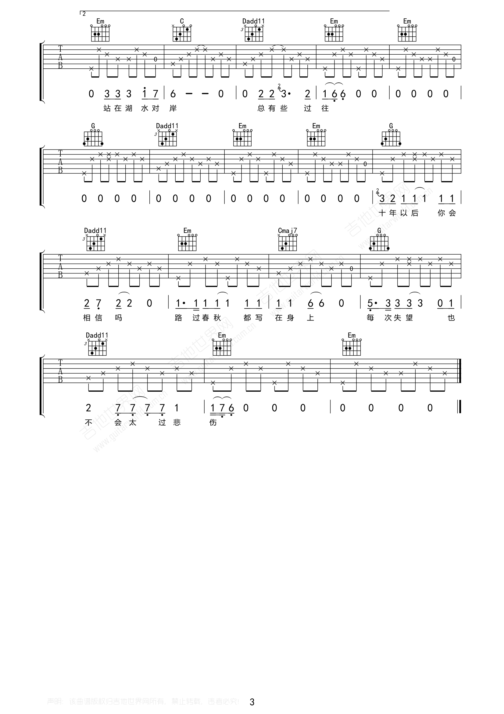 曲谱介绍: 麻园诗人《泸沽湖》吉他弹唱谱,采用G调指法编配,共有3张高清图谱。