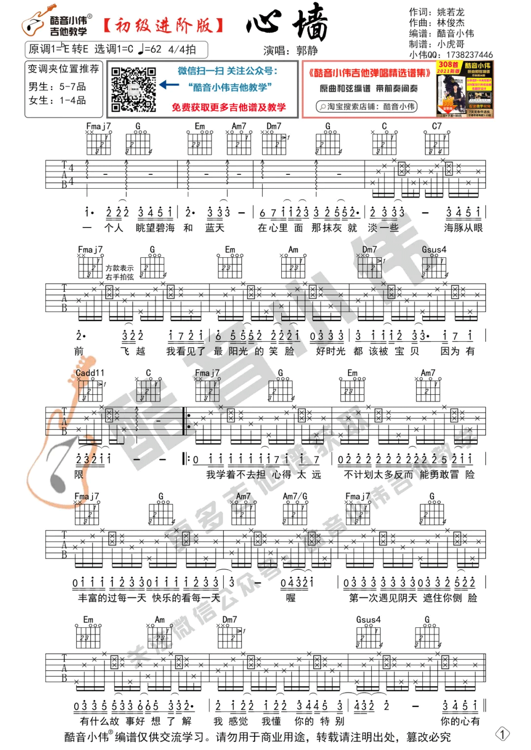 曲谱介绍: 郭静《心墙》吉他弹唱谱,采用C调指法编配,共有2张高清图谱,免翻页排版设计。