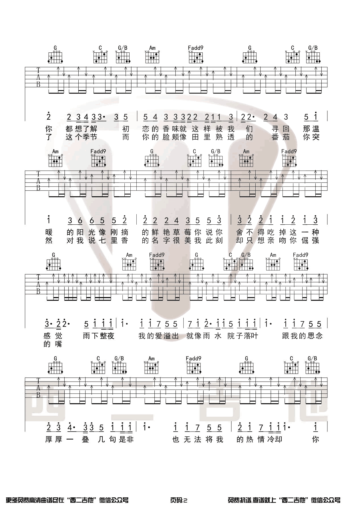 曲谱介绍: 周杰伦《七里香》吉他弹唱谱,采用C调指法编配原版,共有3张高清图谱。