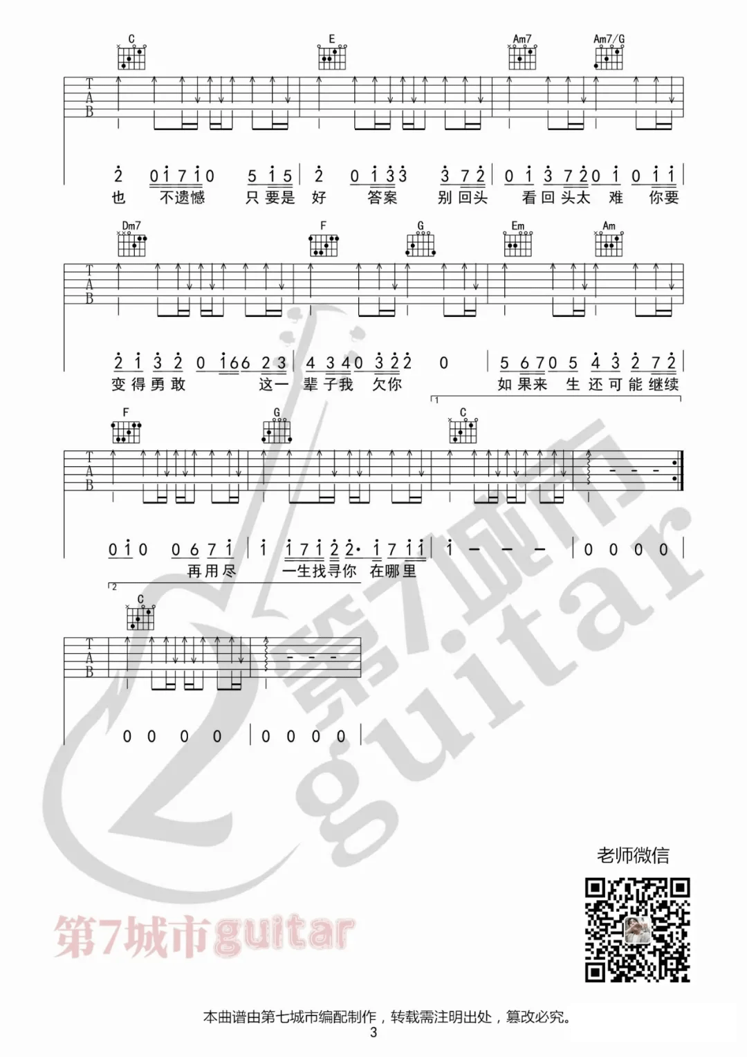曲谱介绍: 李荣浩《不遗憾》吉他弹唱谱,采用C调指法编配,共有3张高清图谱。
