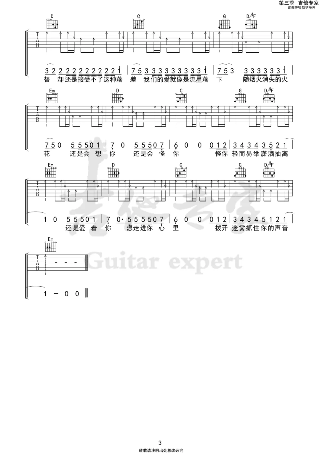 曲谱介绍: 林达浪《还是会想你》吉他弹唱谱,采用G调指法编配,共有3张高清图谱。