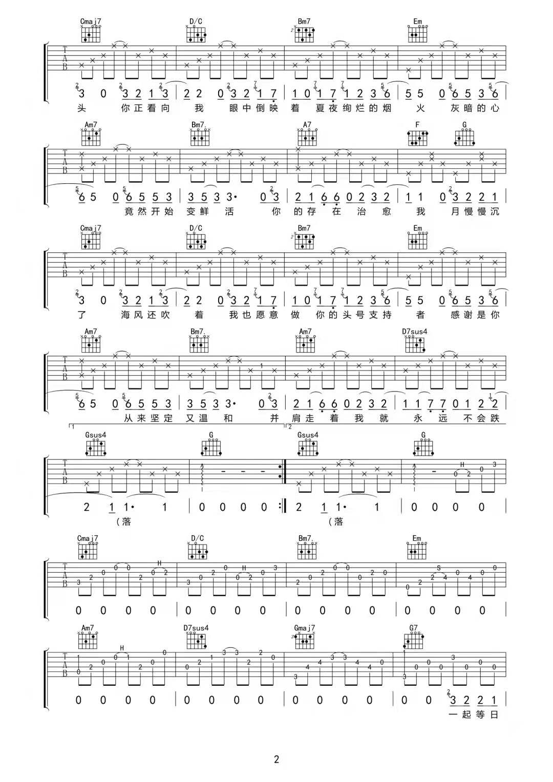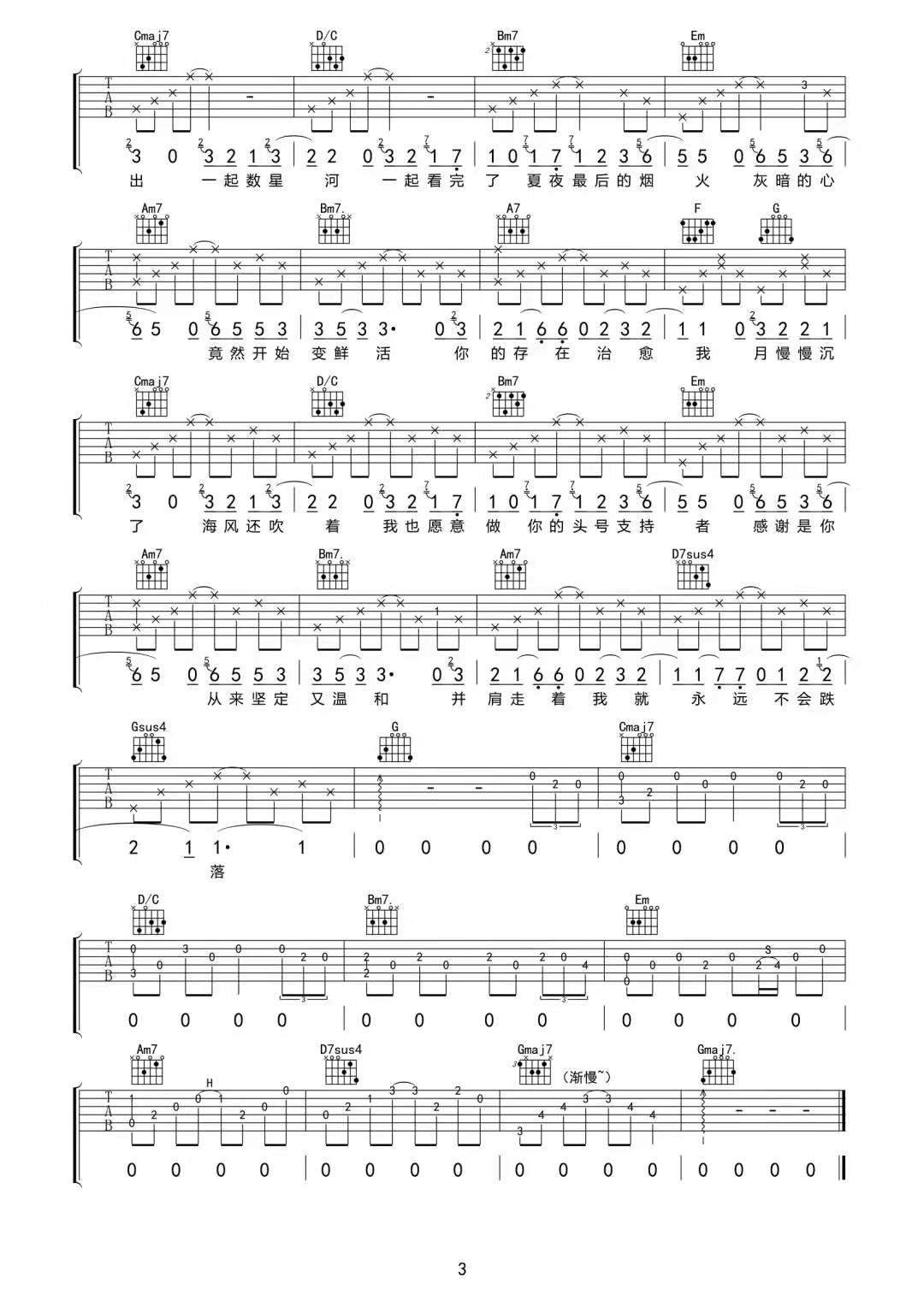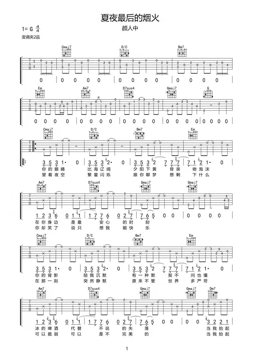 曲谱介绍: 颜人中《夏夜最后的烟火》吉他弹唱谱,采用G调指法编配,共有3张高清图谱。