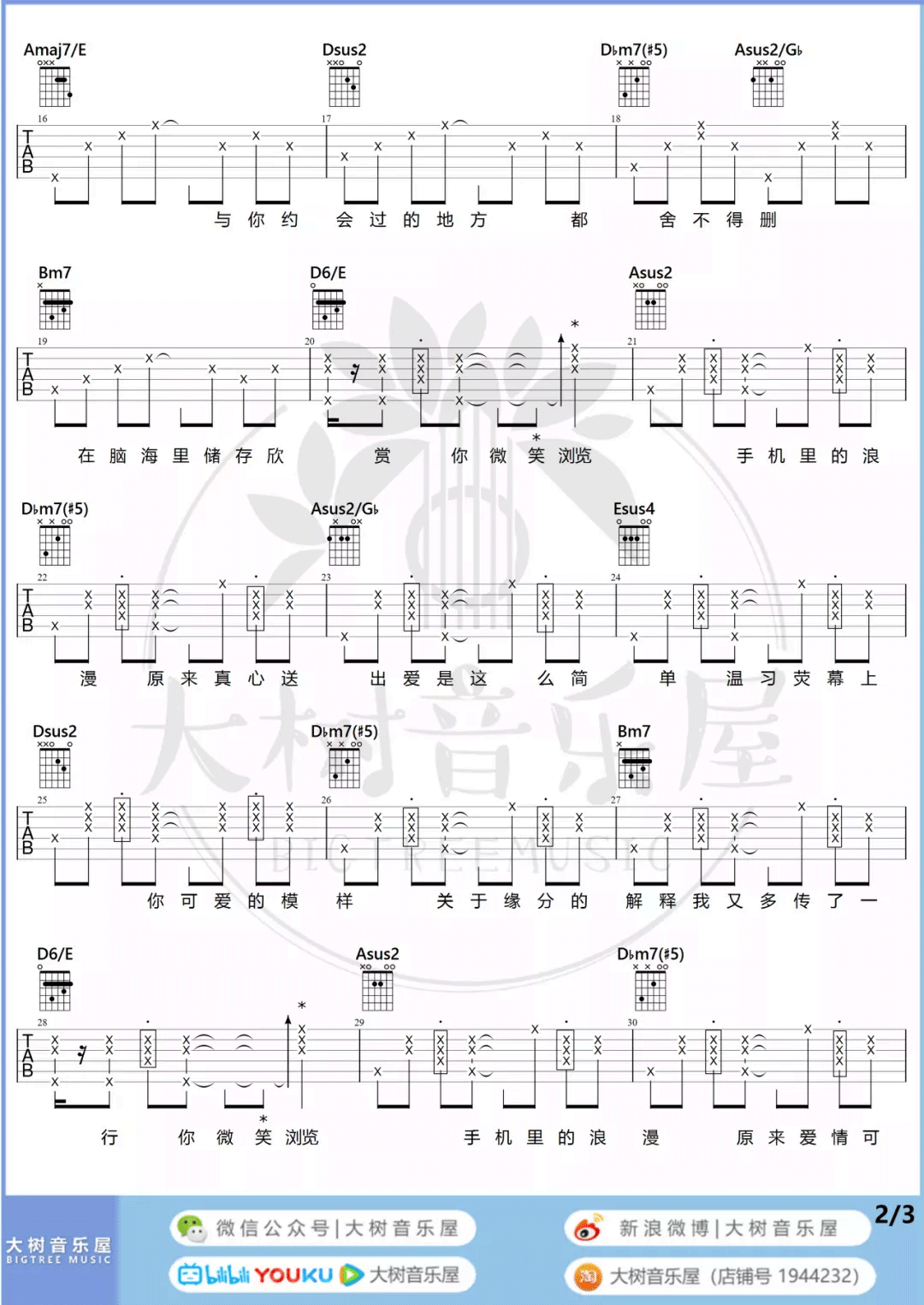 曲谱介绍: 周杰伦《浪漫手机》吉他弹唱谱,采用A调指法编配,共有3张高清图谱。