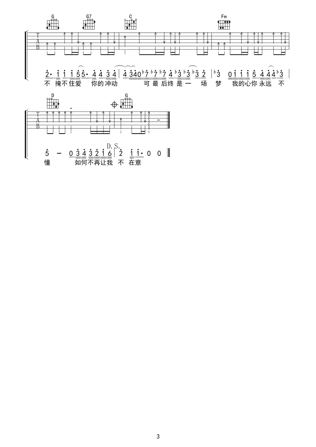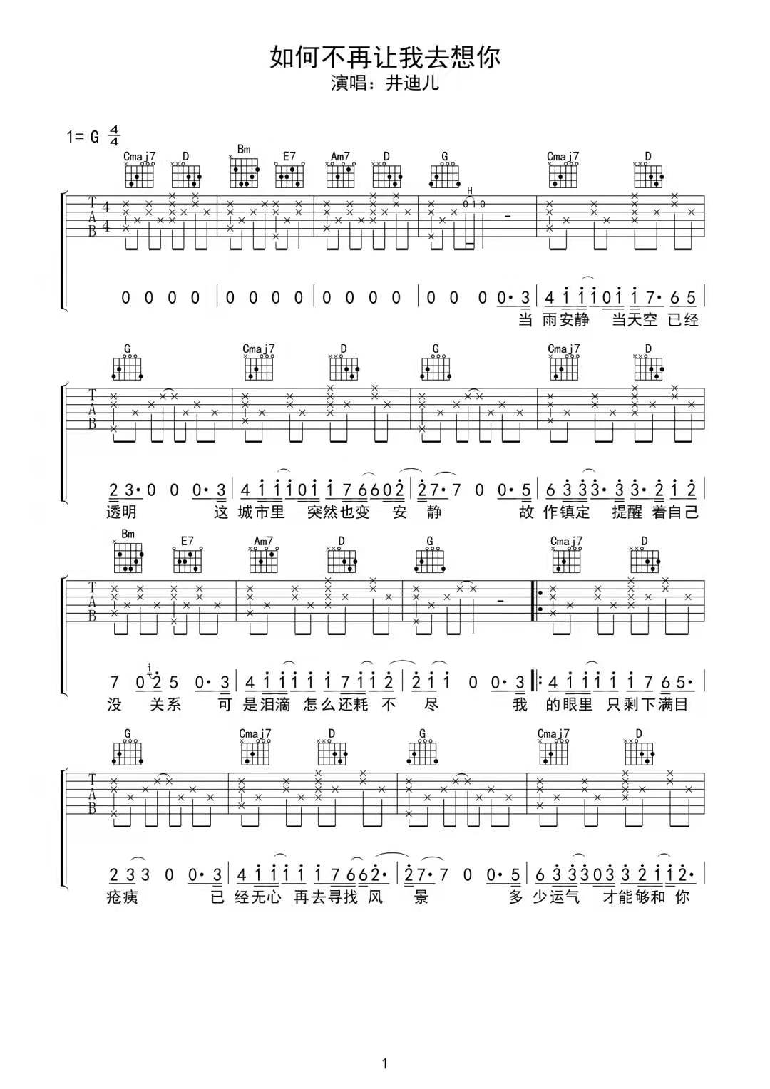 曲谱介绍: 井迪儿《如何不再让我去想你》吉他弹唱谱,采用G调指法编配,共有3张高清图谱。