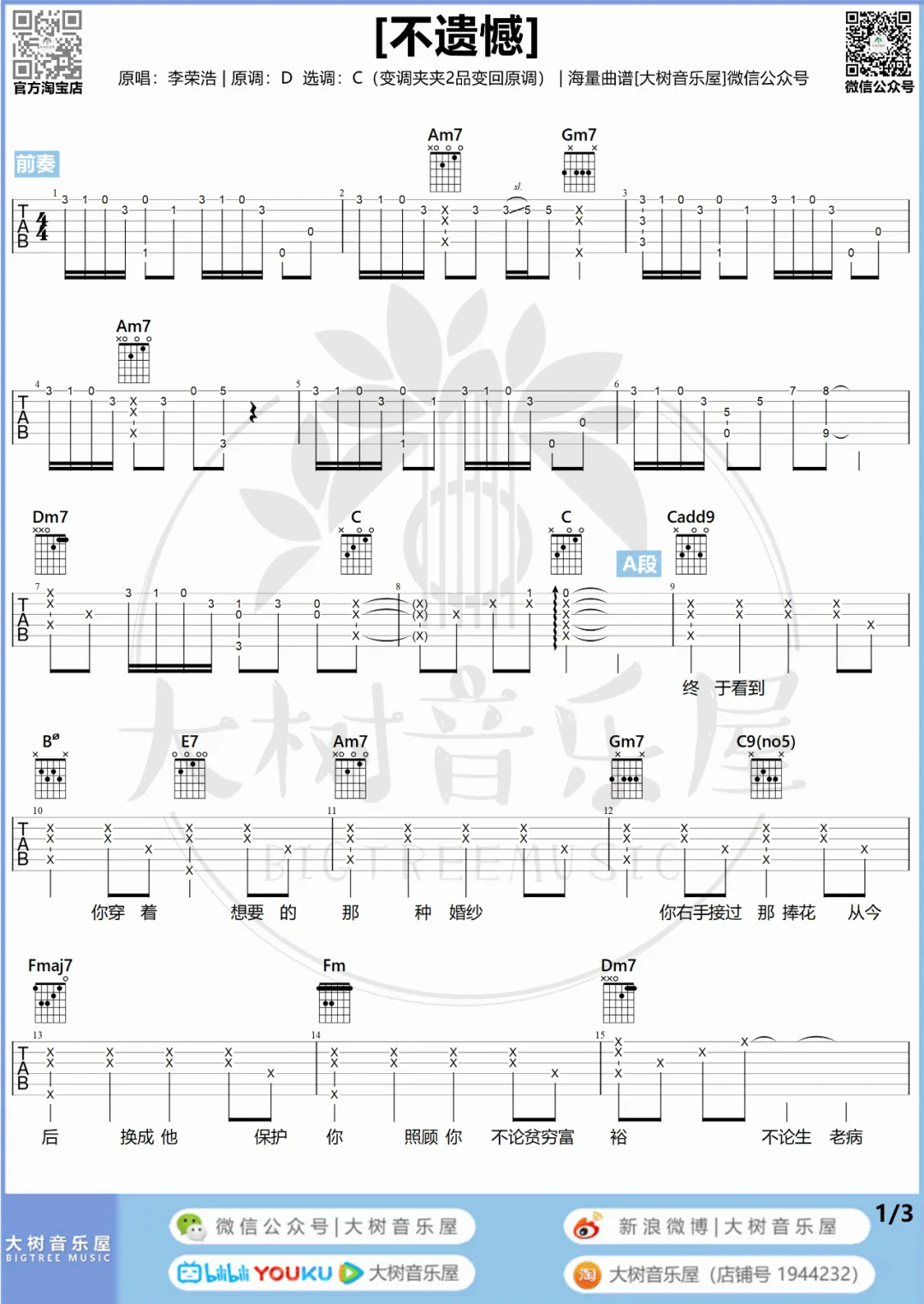曲谱介绍: 李荣浩《不遗憾》吉他弹唱谱,采用C调指法编配,共有3张高清图谱。