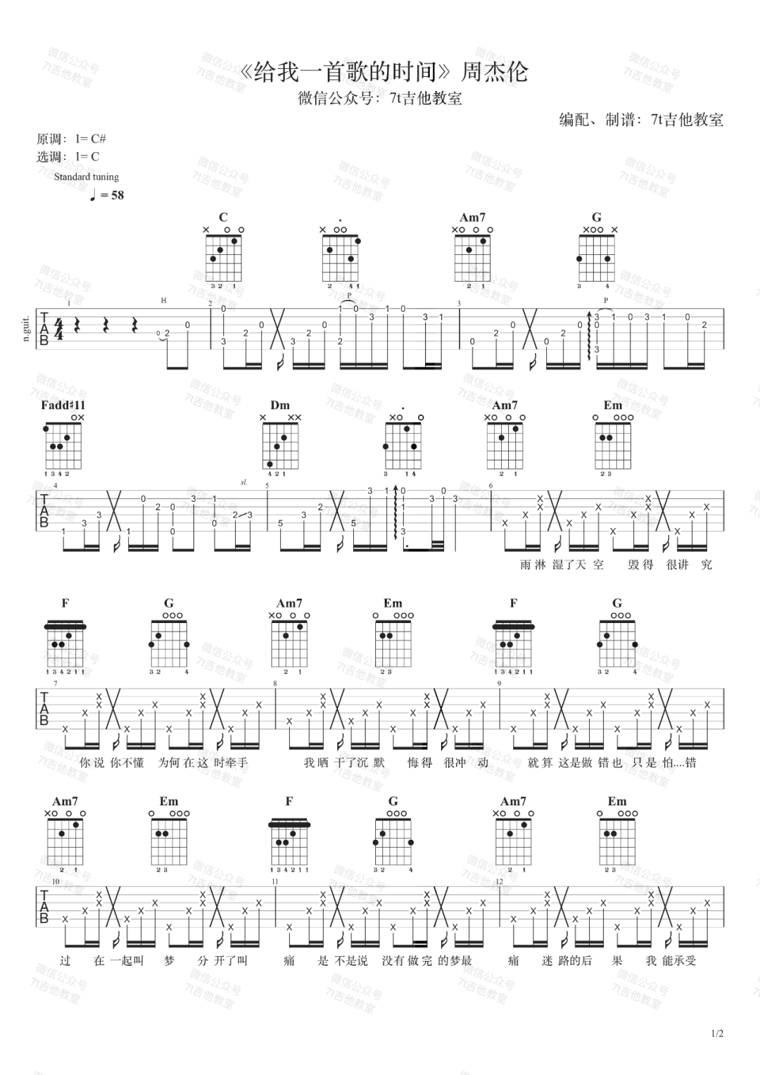 曲谱介绍: 周杰伦《给我一首歌的时间》吉他弹唱谱,采用C调指法编配,共有2张高清图谱,免翻页排版设计。