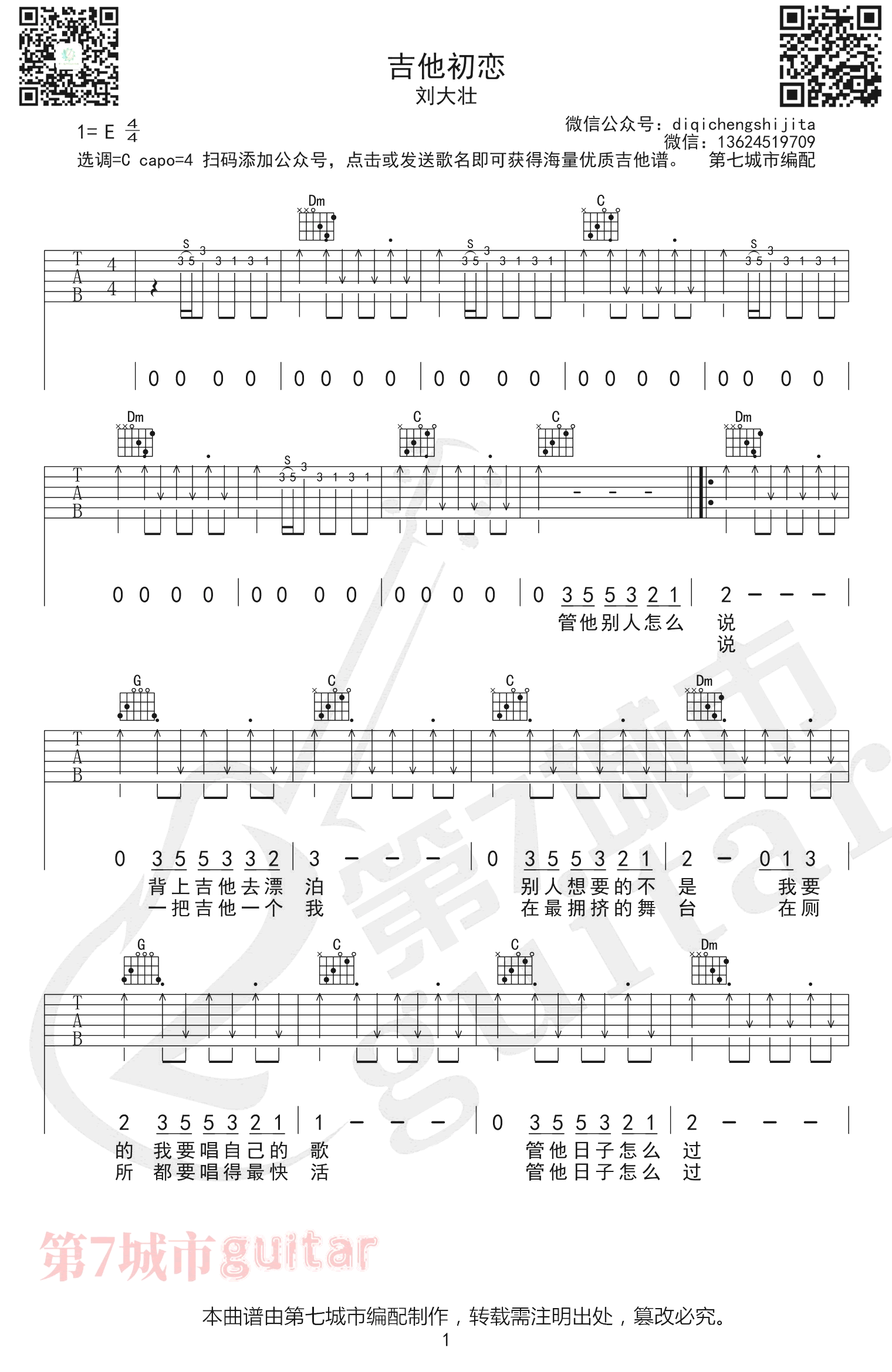 曲谱介绍: 刘大壮《吉他初恋》吉他弹唱谱,采用C调指法编配原版,共有3张高清图谱。