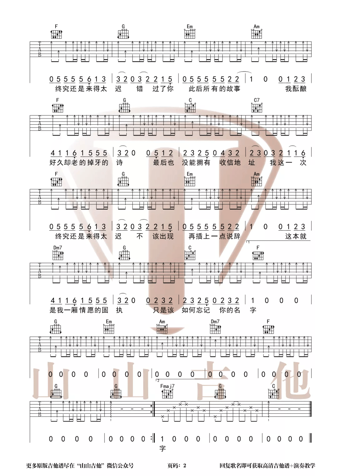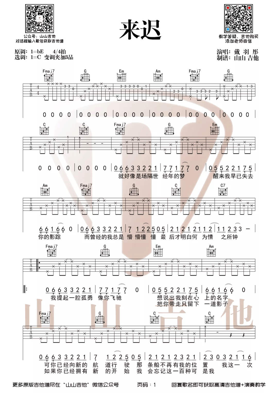 曲谱介绍: 戴羽彤《来迟》吉他弹唱谱,采用C调指法编配,共有2张高清图谱,免翻页排版设计。