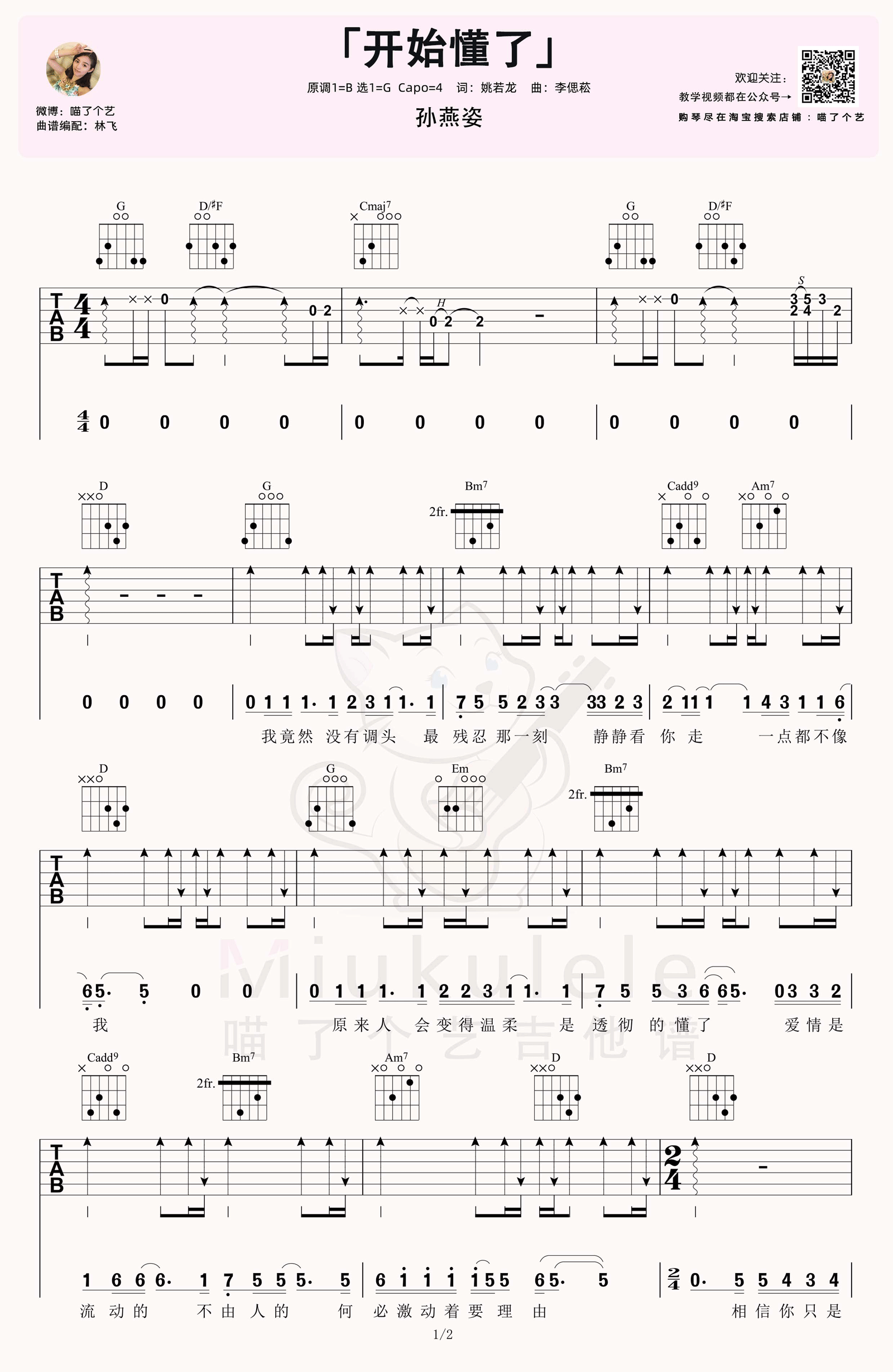 曲谱介绍: 孙燕姿《开始懂了》吉他弹唱谱,采用G调指法编配原版,共有2张高清图谱,免翻页排版设计。