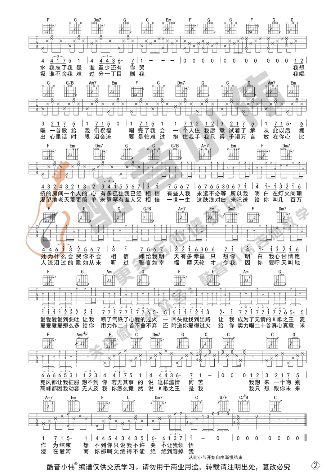 曲谱介绍: 陈奕迅《K歌之王》吉他弹唱谱,采用C调指法编配,共有2张高清图谱,免翻页排版设计。